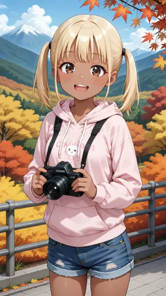 parameters: masterpiece, best quality, absurdres, anime, absurdly beautiful and cute teenage, little stature, petite, kawaii, dark skin, small medium breasts, small round face, yellow blonde hair, bangs, twintails, hair tie, brown eyes, tareme, eyelashes, clear lip, hoodie, denim shorts, autumn leaves, mountain, holding sketchbook, laughing, (ahoge:-1.0), looking at viewer, nose blush,