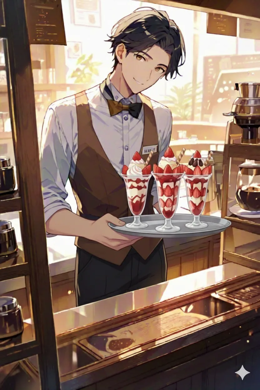 とりあえずGeminiも使いましたが、元絵にお盆の苺サンデーを持たせたりする枝ともってる腕と元の腕と同時に描いたりでそれを消してもらうのにもっかい頼んだりで結構面倒。最初の文章をもう少し考えないとですか