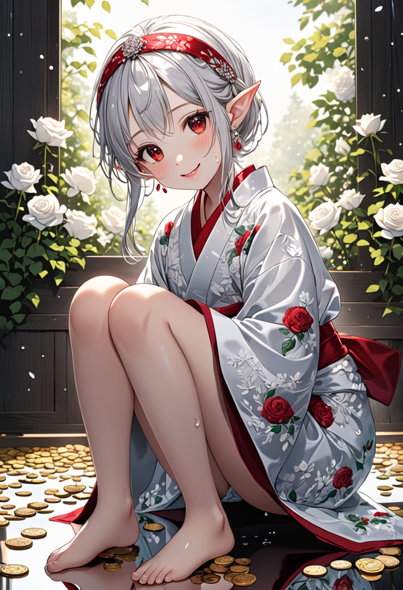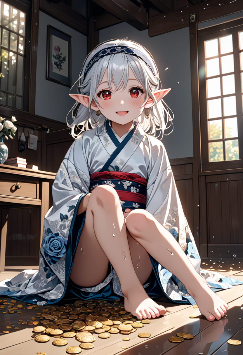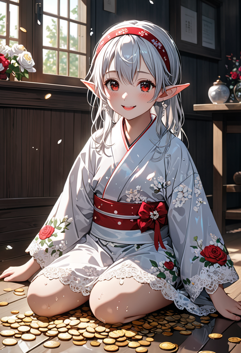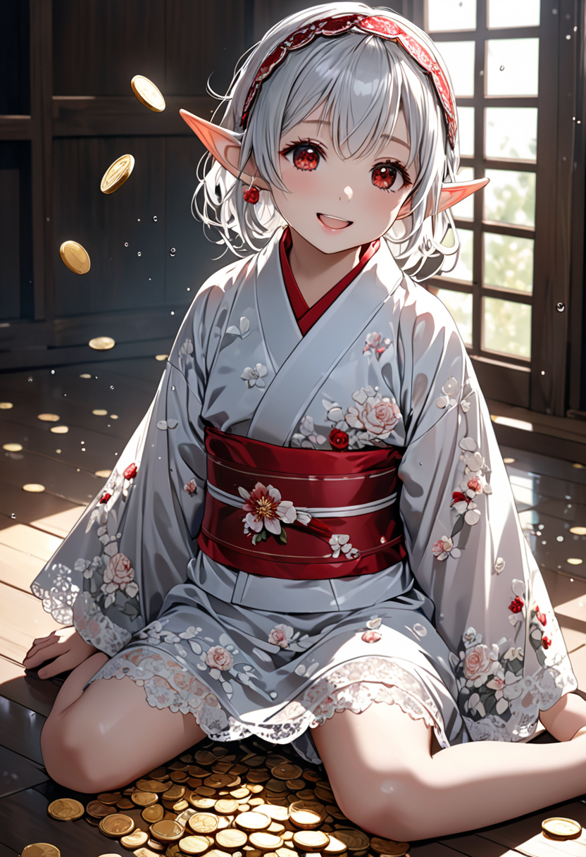 Elf Girl Smiling Amidst a Pile of Gold Coins