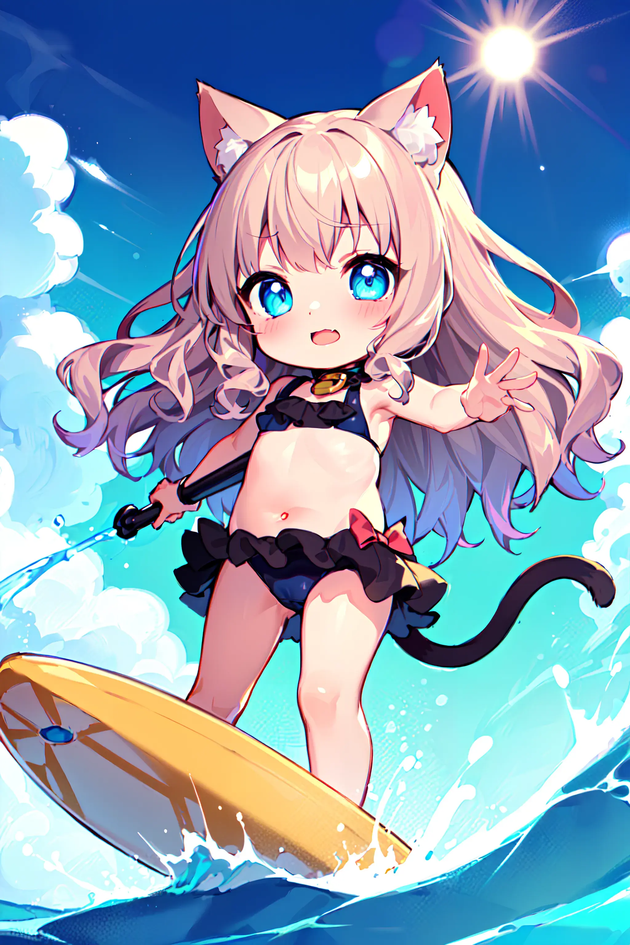 |girl standing tall on surfboard, balancing with outstretched arms, riding a massive ocean wave, her wetsuit glistening in the sunlight, sea spray in the air, surfboard cutting through the blue water, the thrill of the ride evident on her face, her body silhouetted against the sun, flounce, frill bikini