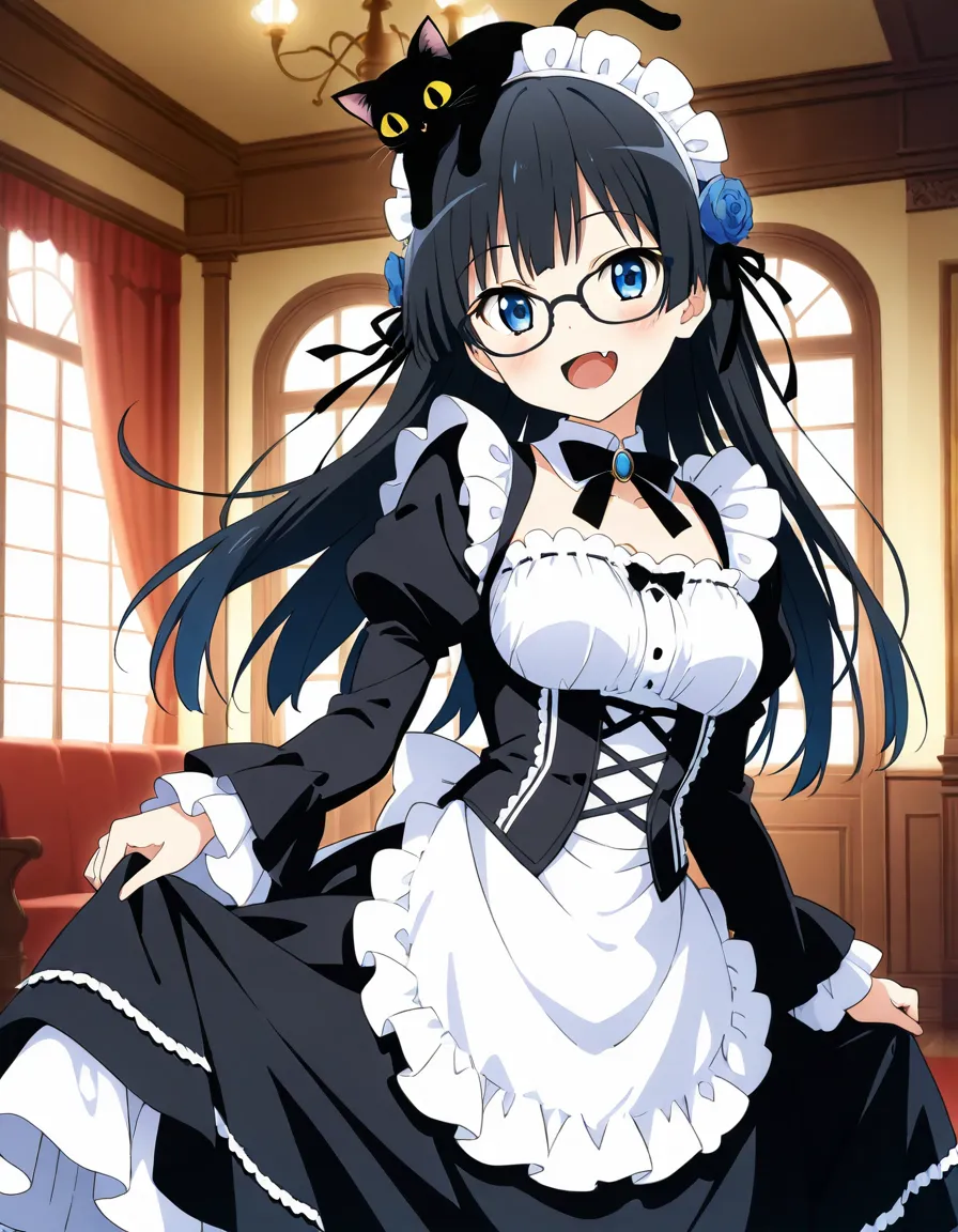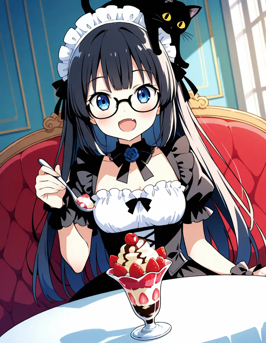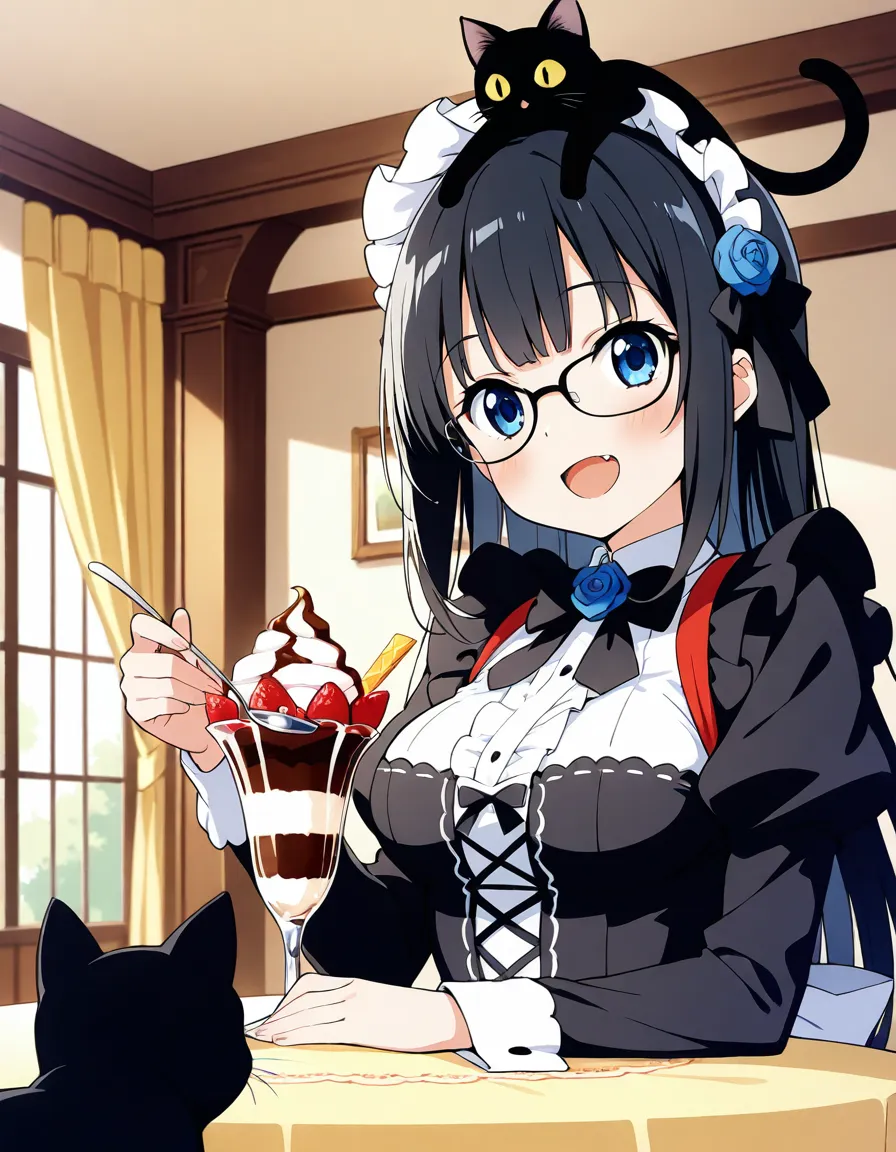 parameters: ((masterpiece)), ((best quality)), (ultra-detailed), ((kawaii)), cute, (lovely), animated style illustration, (Interior of an old-fashioned Western-style mansion:1.3), 1girl, cute girl, (solo), (detailed face), (beautiful blue eyes), (beautiful black hair), long hair, (glasses:1.2), slim, slender, medium breast, ((beautiful breast)), (refreshing smile:1.3), open mouth, (fang), (Dutch angle shot:1.3), (black cat on head:1.3), maid headdress, (elegant pose), A beautiful anime girl cosplaying as Kuroneko from Oreimo, (wearing Kuroneko's iconic black Gothic Lolita outfit), small Rose hair accessory, happy atmosphere, ((giant Chestnut sundae with caramel sauce)), (Holding a spoon in one hand), Caramel colored tablecloth , table, sitting, detailed background, soft shading, vibrant colors.