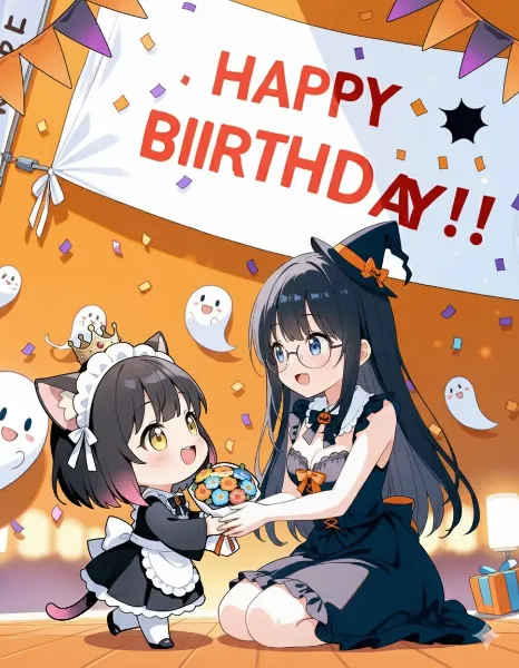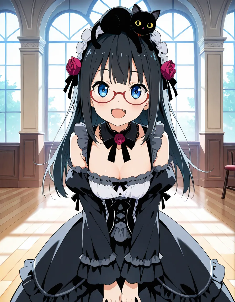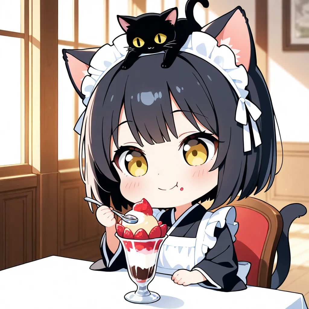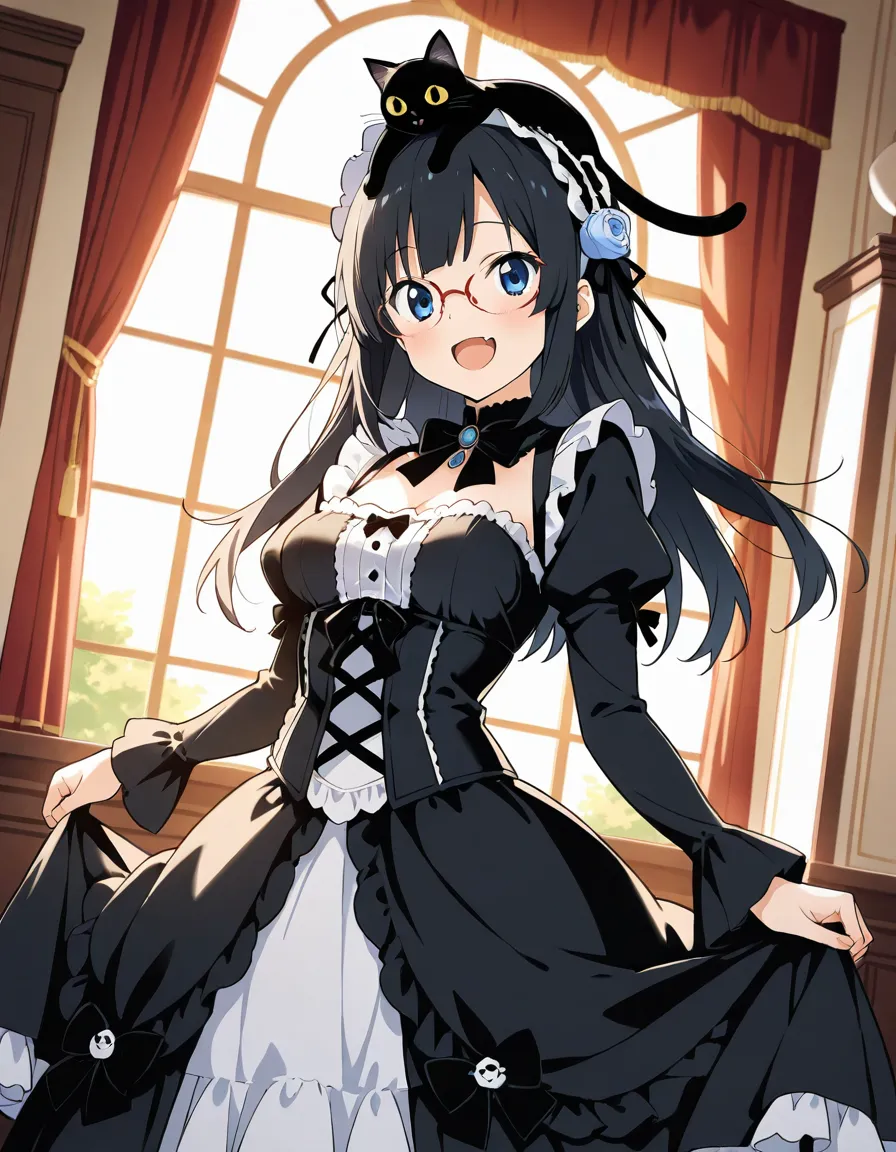 parameters: ((masterpiece)), ((best quality)), (ultra-detailed), ((kawaii)), cute, (lovely), animated style illustration, (Interior of an old-fashioned Western-style mansion:1.3), 1girl, cute girl, (solo), (detailed face), (beautiful blue eyes), (beautiful black hair), long hair, (glasses:1.2), slim, slender, medium breast, ((beautiful breast)), (refreshing smile:1.3), open mouth, (fang), (Dutch angle shot:1.3), (black cat on head:1.3), maid headdress, (elegant pose), A beautiful anime girl cosplaying as Kuroneko from Oreimo, (wearing Kuroneko's iconic black Gothic Lolita outfit), small Rose hair accessory, happy atmosphere, ((giant Chestnut sundae with caramel sauce)), (Holding a spoon in one hand), Caramel colored tablecloth , table, sitting, detailed background, soft shading, vibrant colors.