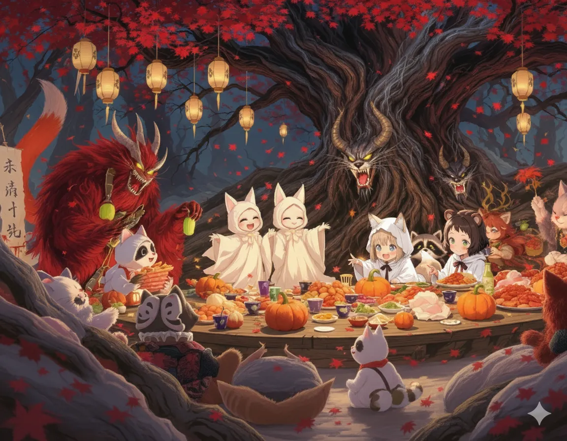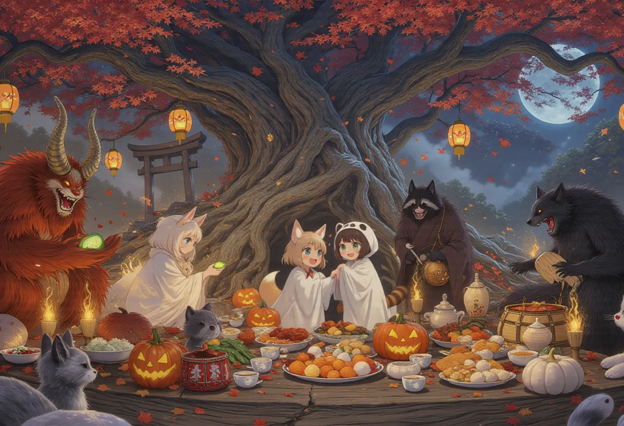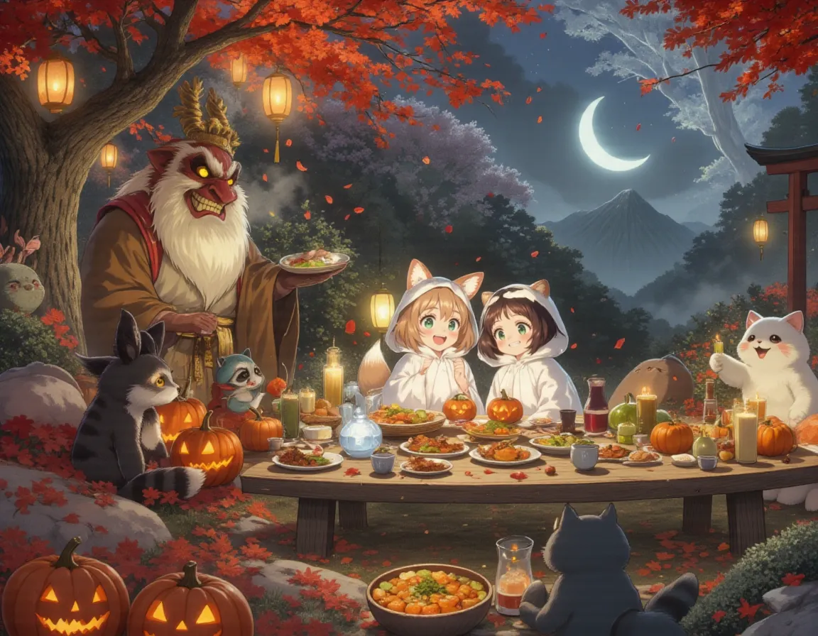 parameters: A magical and heartwarming scene of a lively Halloween party in a forest clearing deep in the mountains, hosted by various friendly Japanese yokai (supernatural creatures). Two young kemonomimi girls in adorably obvious "ghost" costumes have joined the festivities, and all the yokai kindly pretend not to notice their poorly hidden animal features.