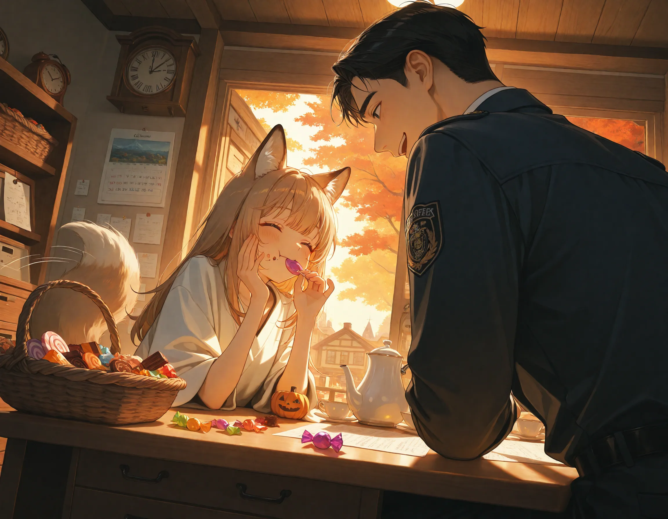 parameters: 1boy, 1girl, height difference, age difference, rural police box, koban, countryside, village, autumn, halloween, heartwarming scene, (cowboy shot:1.4), dynamic angle, dynamic pose, , from behind ,