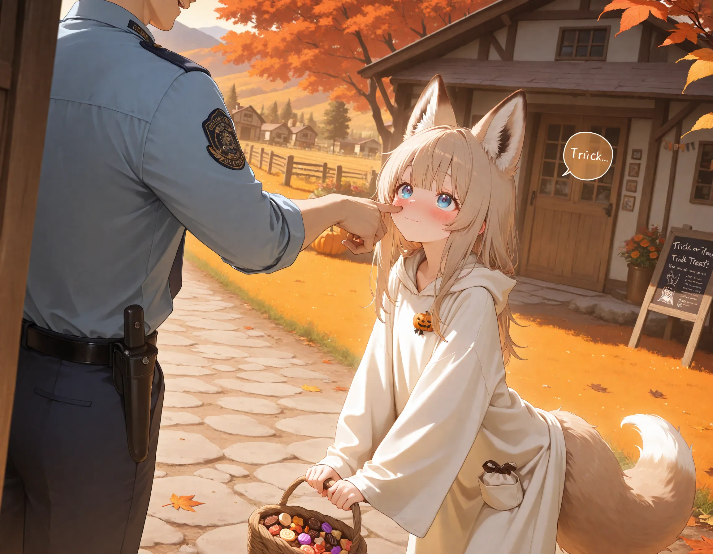 short girl, light brown hair, Waist-length long hair, bangs, blue eyes, (light brown fox ears, Light brown fox tail with white tip, petite, flat chest), fluffy tail, shy expression, bashful, embarrassed, expectant, hopeful, blushing, looking up, small smile, white sheet costume, ghost costume, wearing white sheet, sheet with eye holes, fox ears poking through sheet, fox tail visible under sheet, handmade costume, simple costume, holding sheet hem, small bag, carrying small pouch, nervous posture, leaning forward slightly, speech bubble, (english text "trick or treat"),