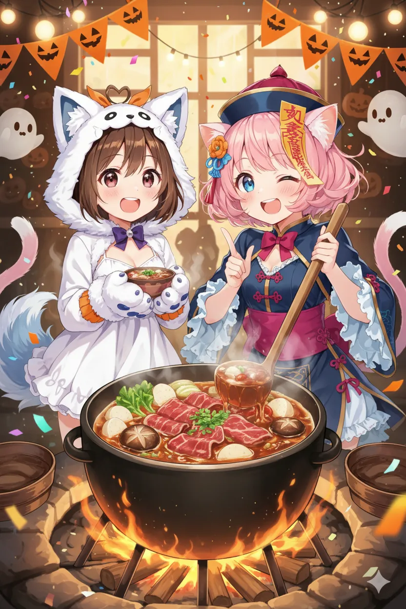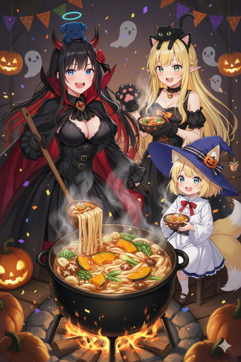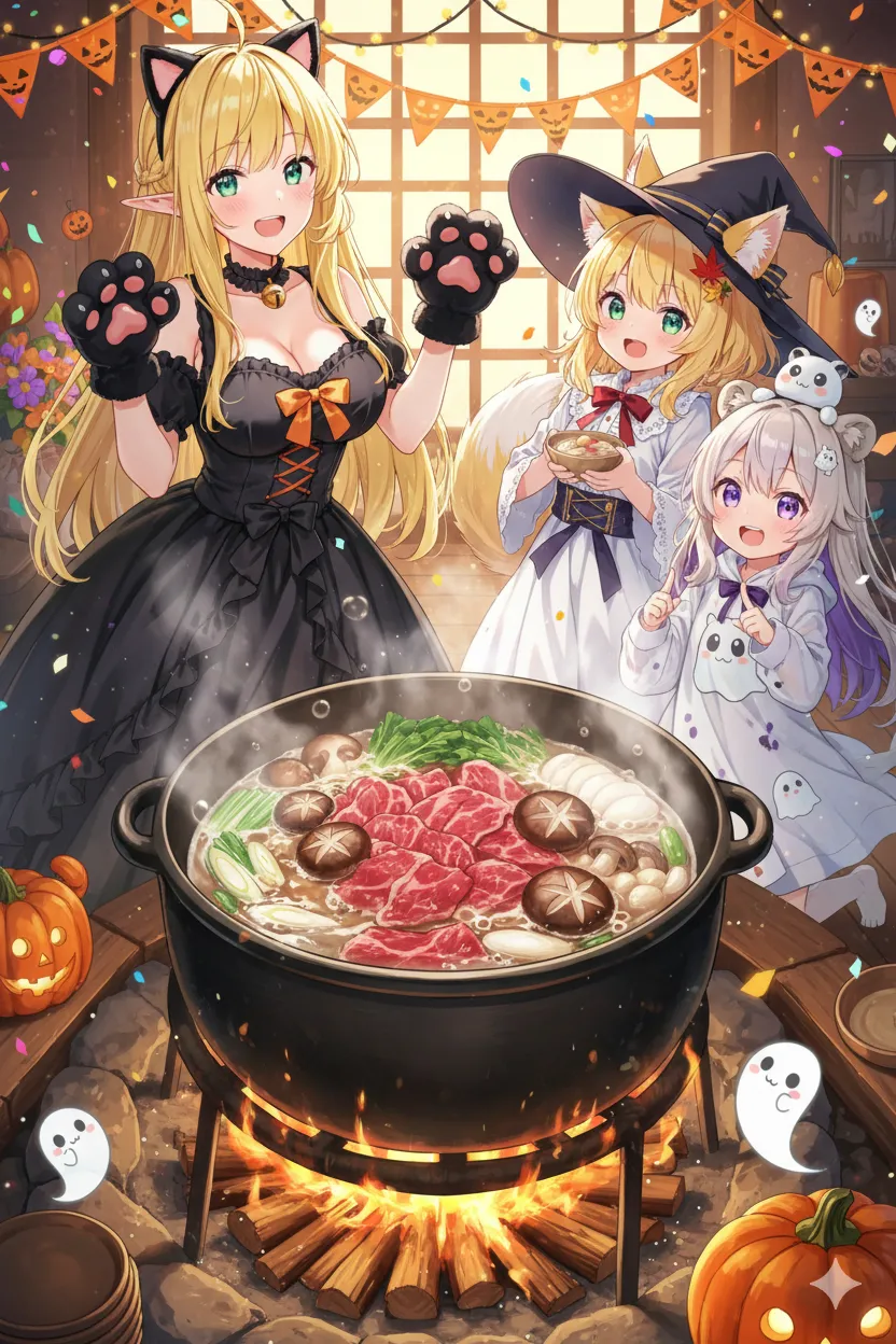 大きなお鍋、すごいな~♪ お菓子は明日もらえるから、今日はお肉くれなきゃいたずらしちゃうぞ~!