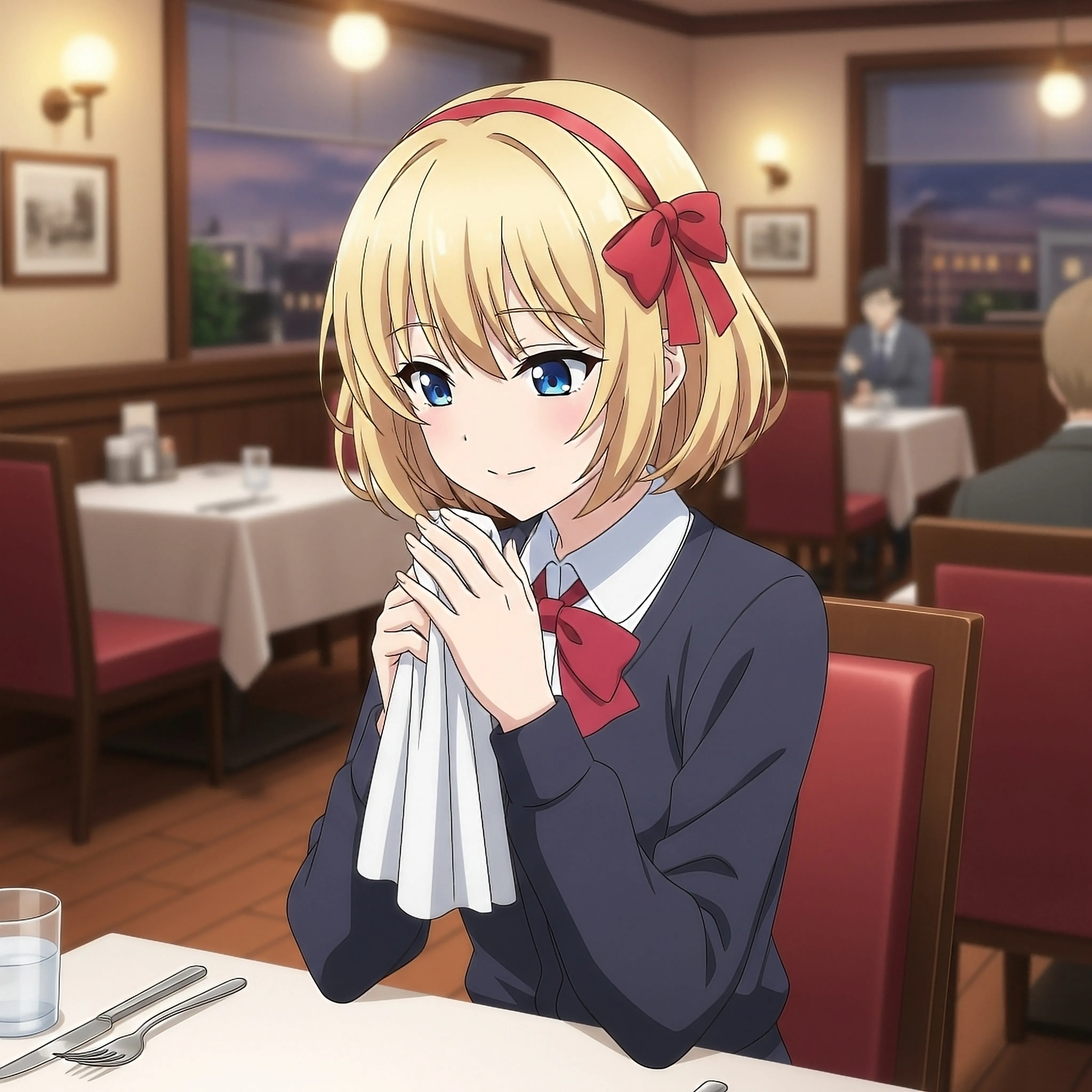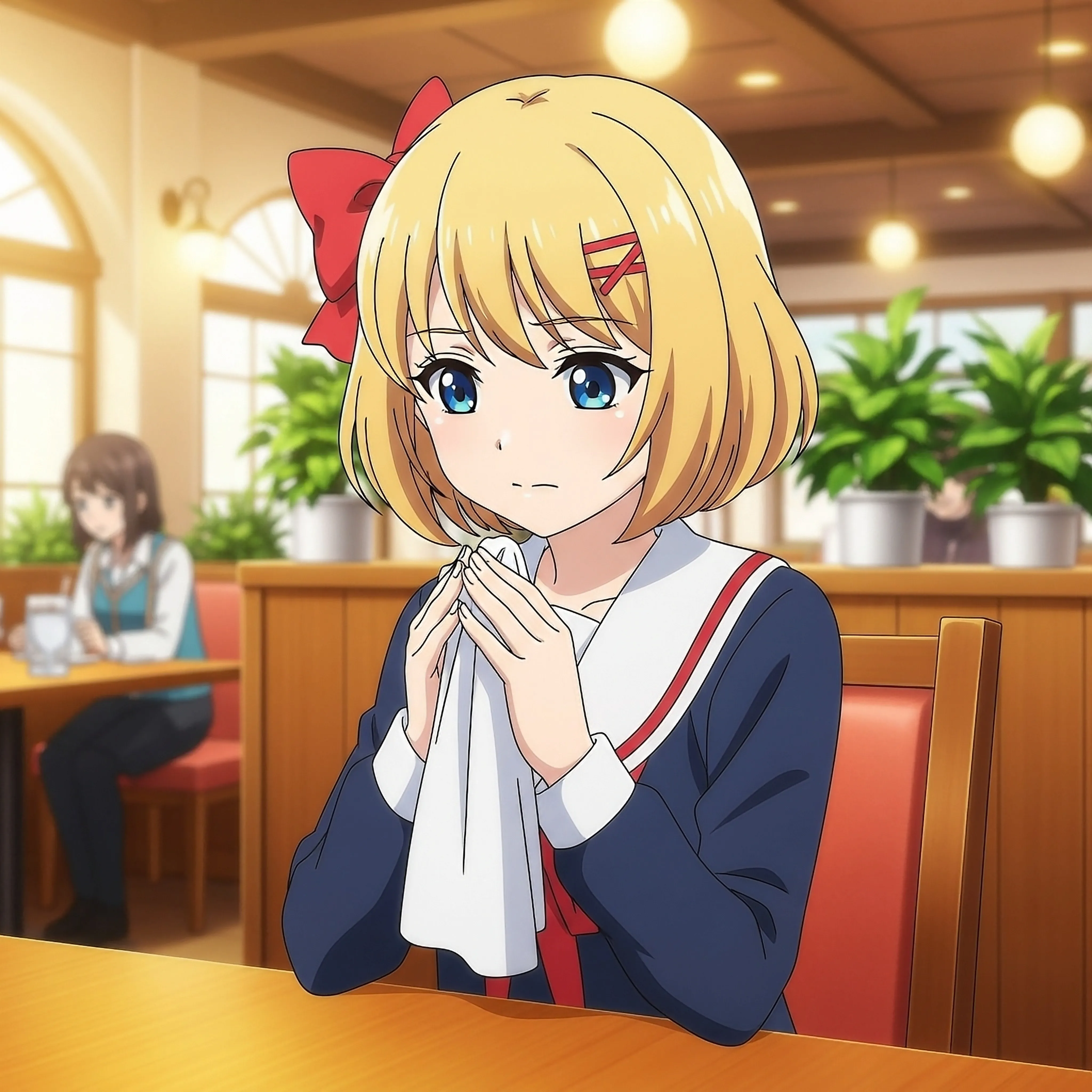 レストランでおしぼりで拭いているムスメさんです