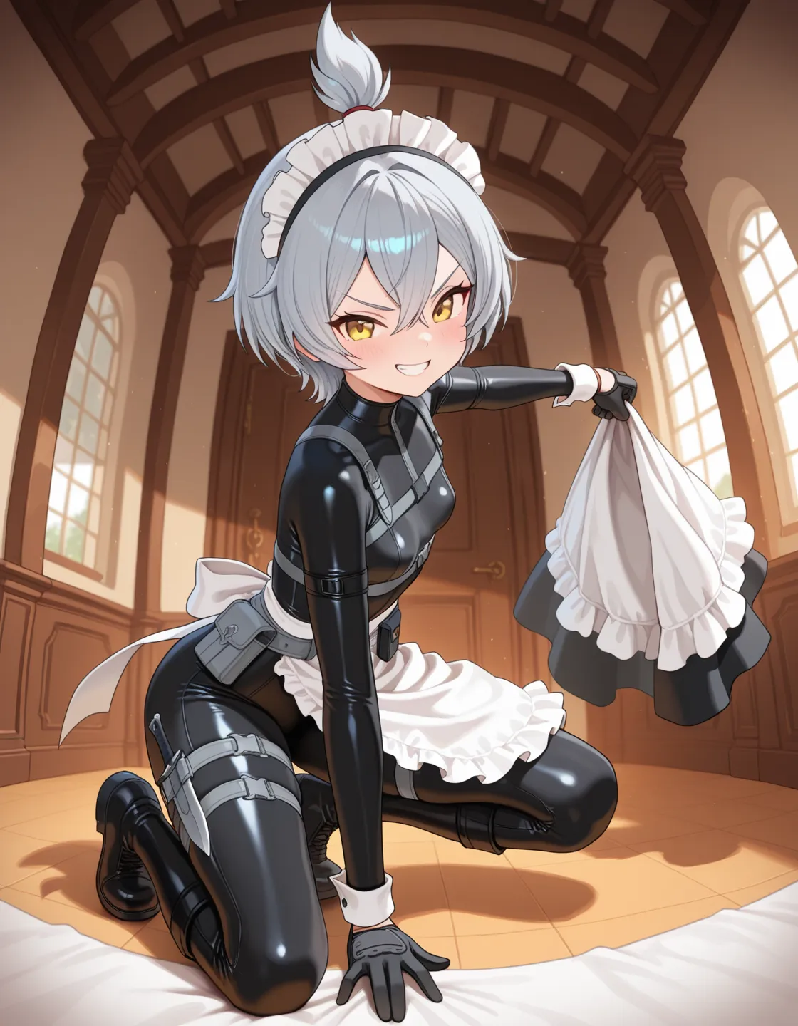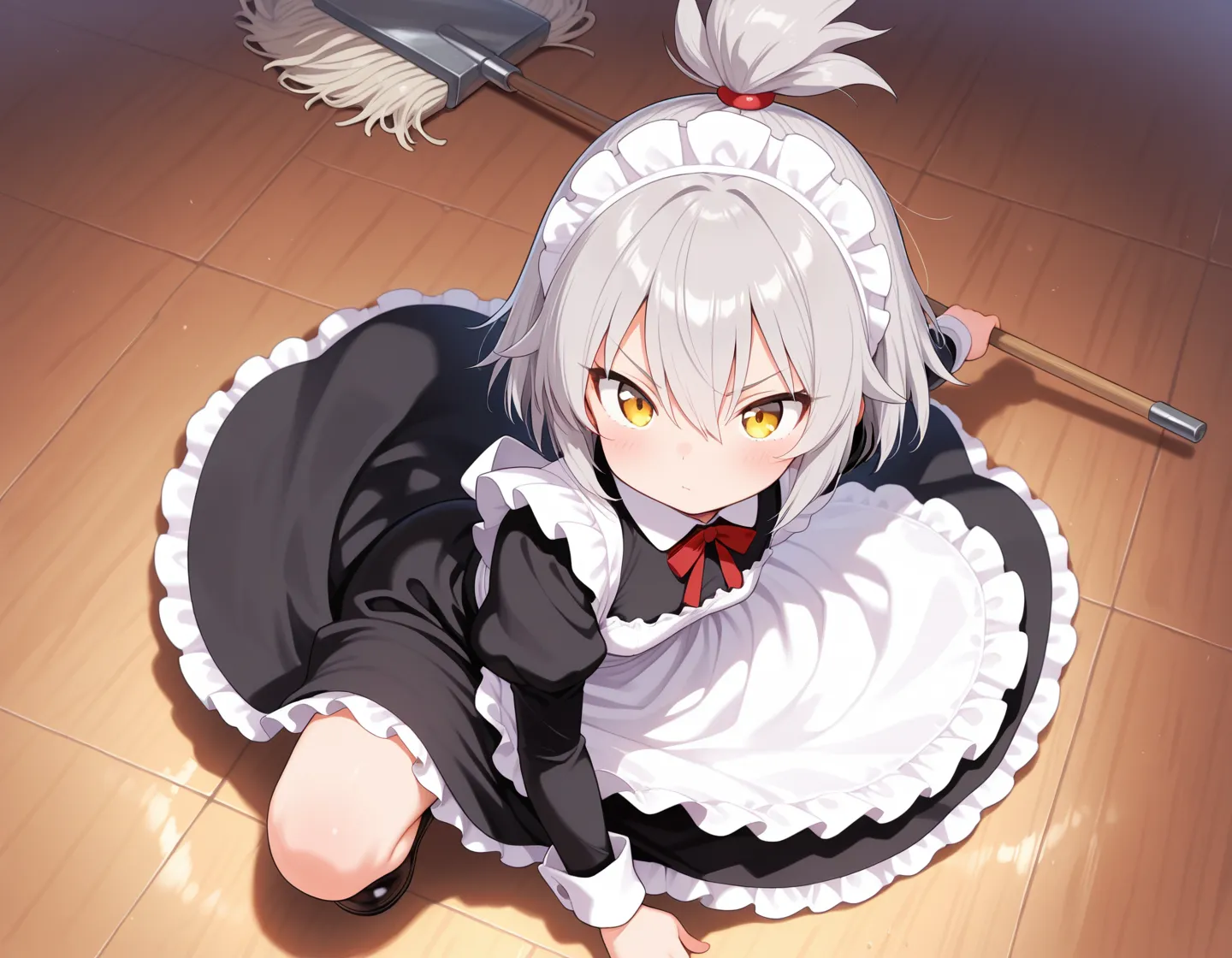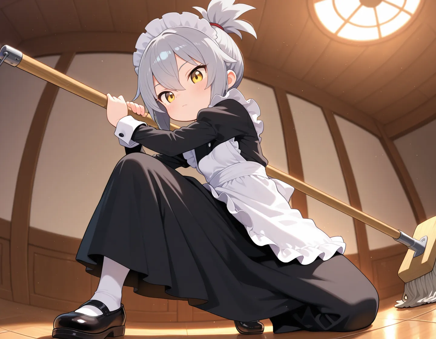 maid,maid headdress, maid apron, holding [polearm:mop:0.2], two-handed,