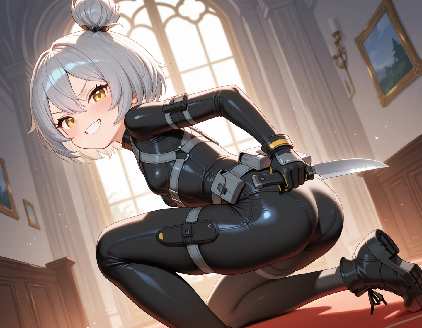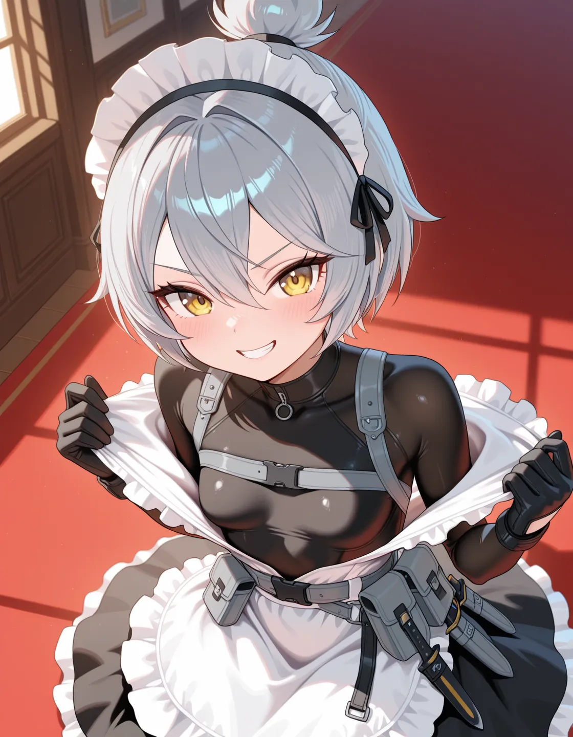 1girl, loli, small breasts, grey hair, (short hair:0.9), kinky hair, hair between eyes, long topknot, yellow eyes, tsurime, v-shaped eyebrows,