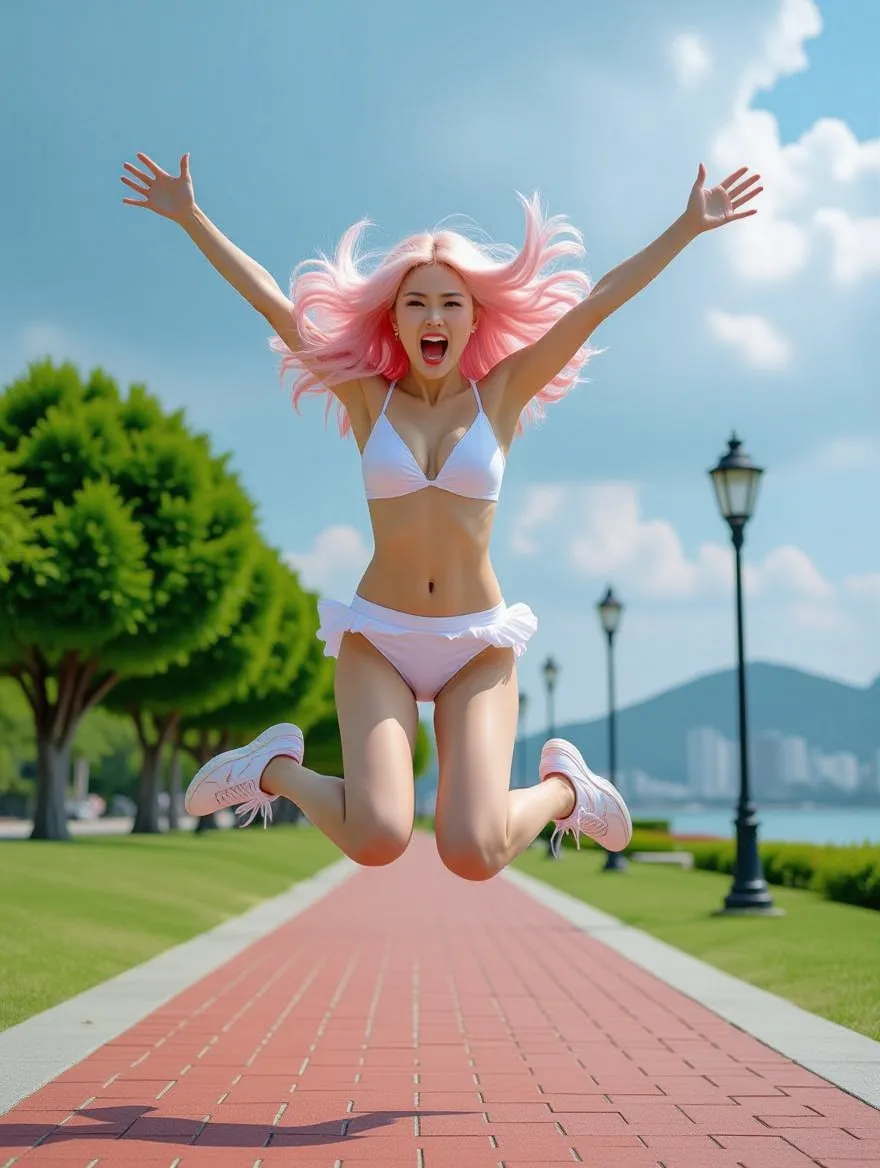 怒りの跳躍、曇天の公園に咲く桜色の衝動 / Leap of Fury: A Cherry-Haired Surge Beneath the Overcast Sky