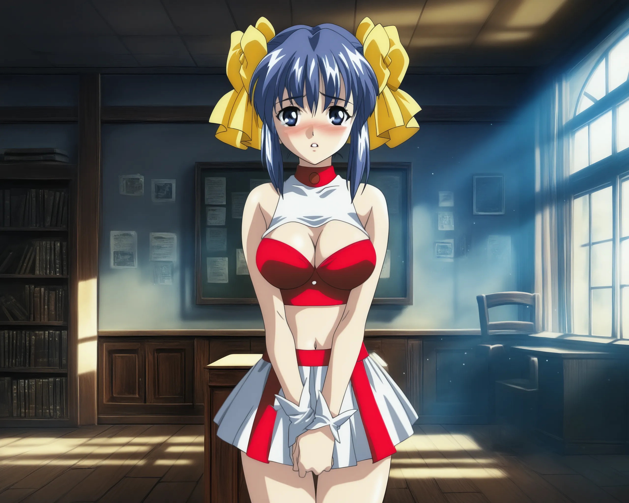 An anime-style illustration of a blue-haired twintail girl in a cheerleader outfit in a classroom.