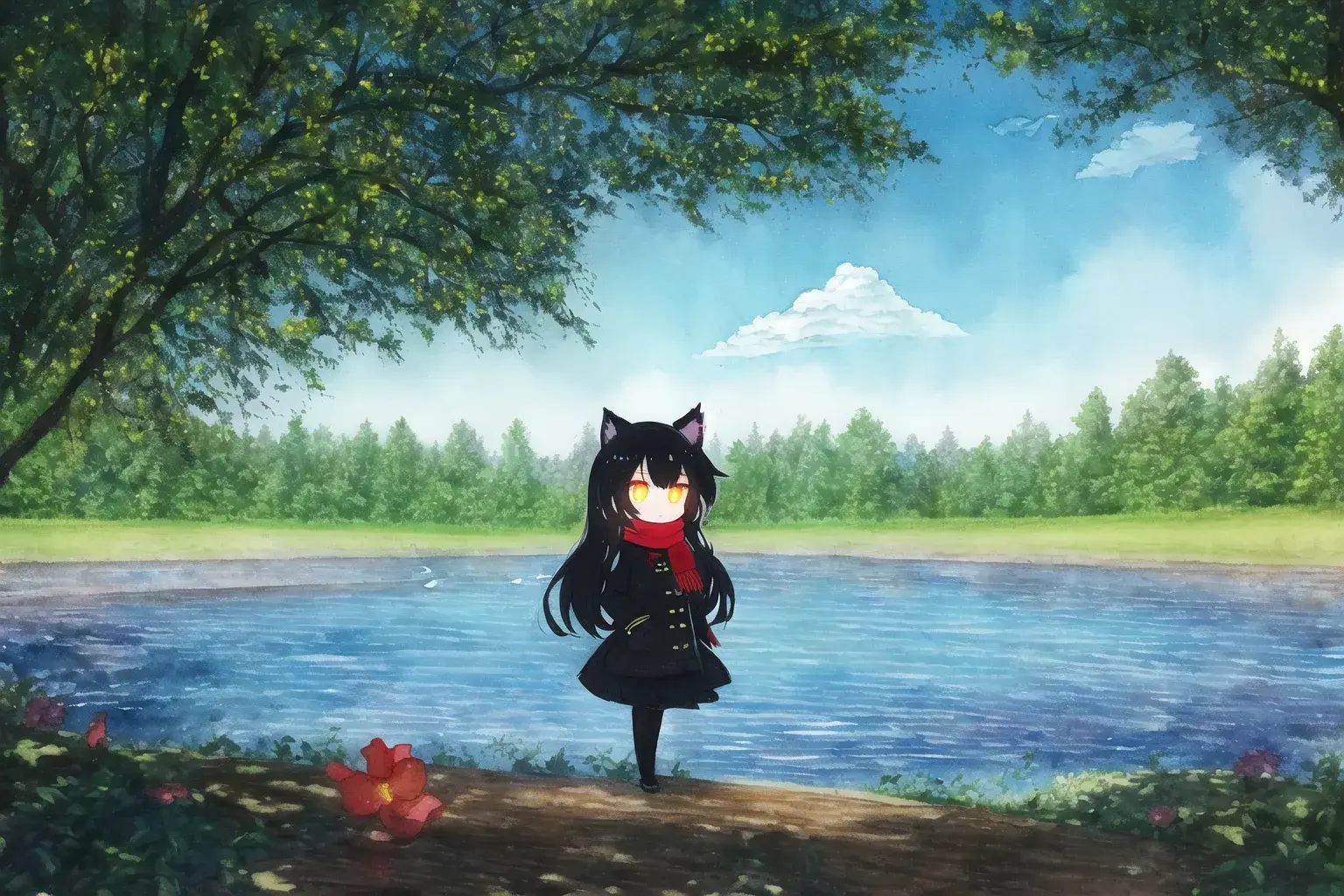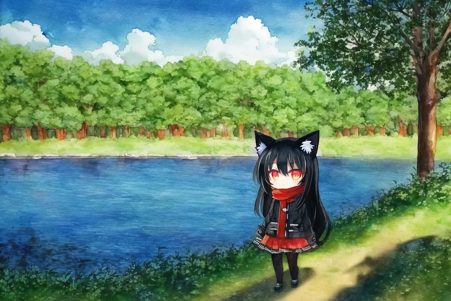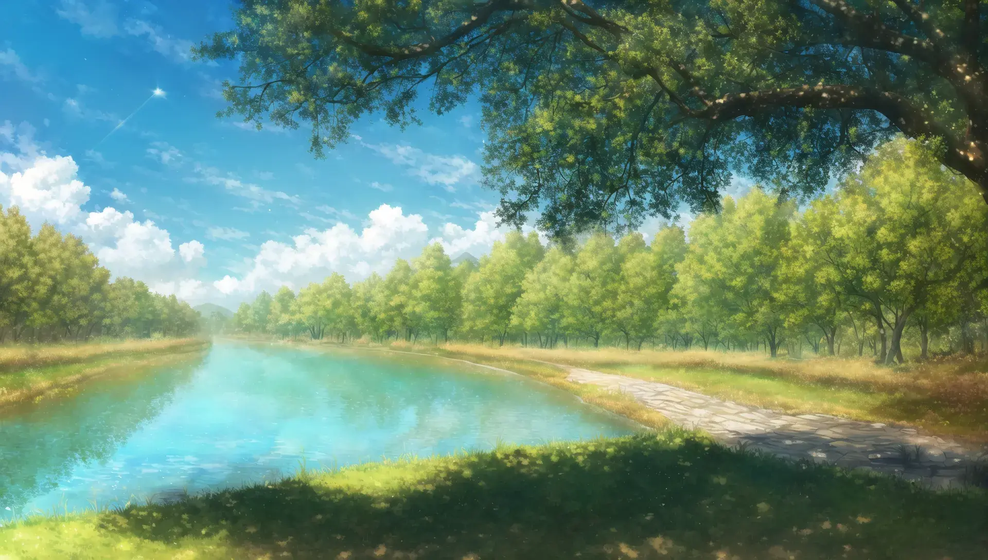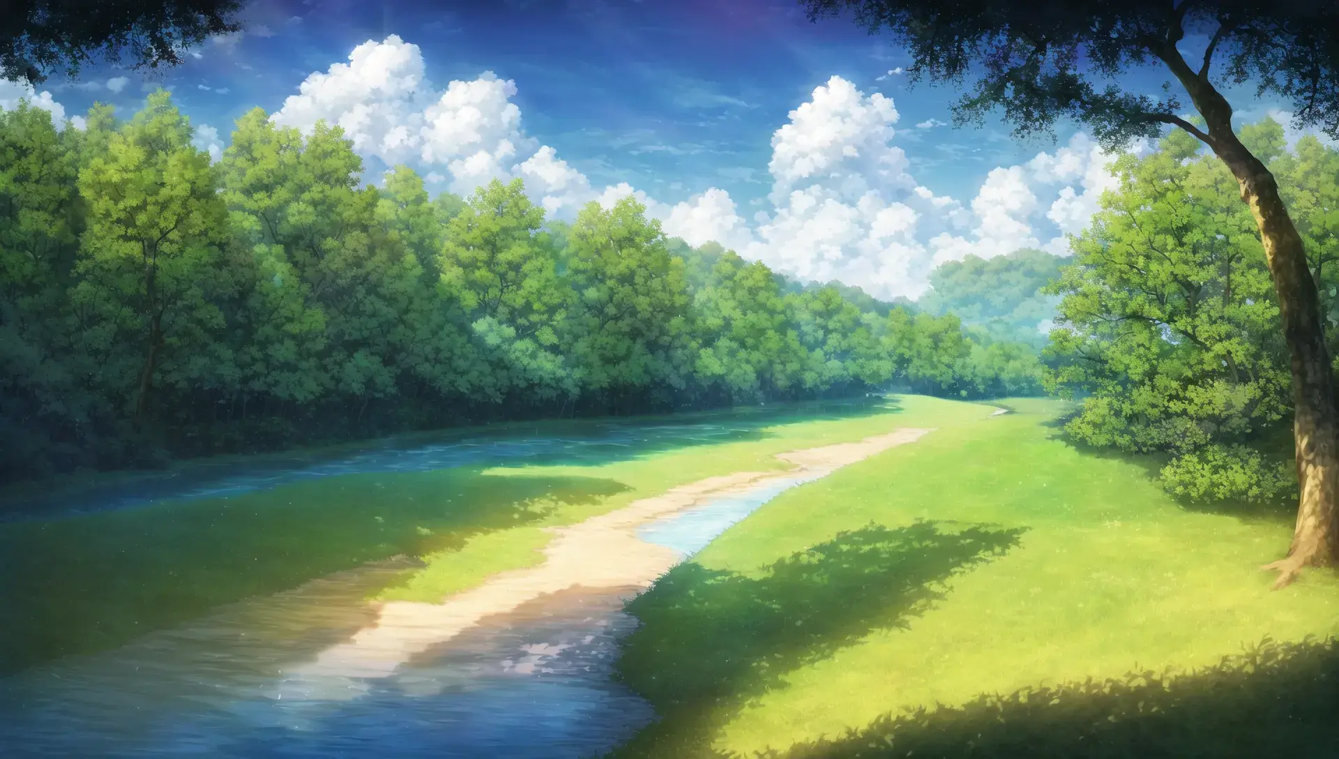 {river surrounded by trees},blue sky and cumulonimbus,{camping},Riverside,{in shadow},arbor,light reflecting in the river,tree shade, sunbeams