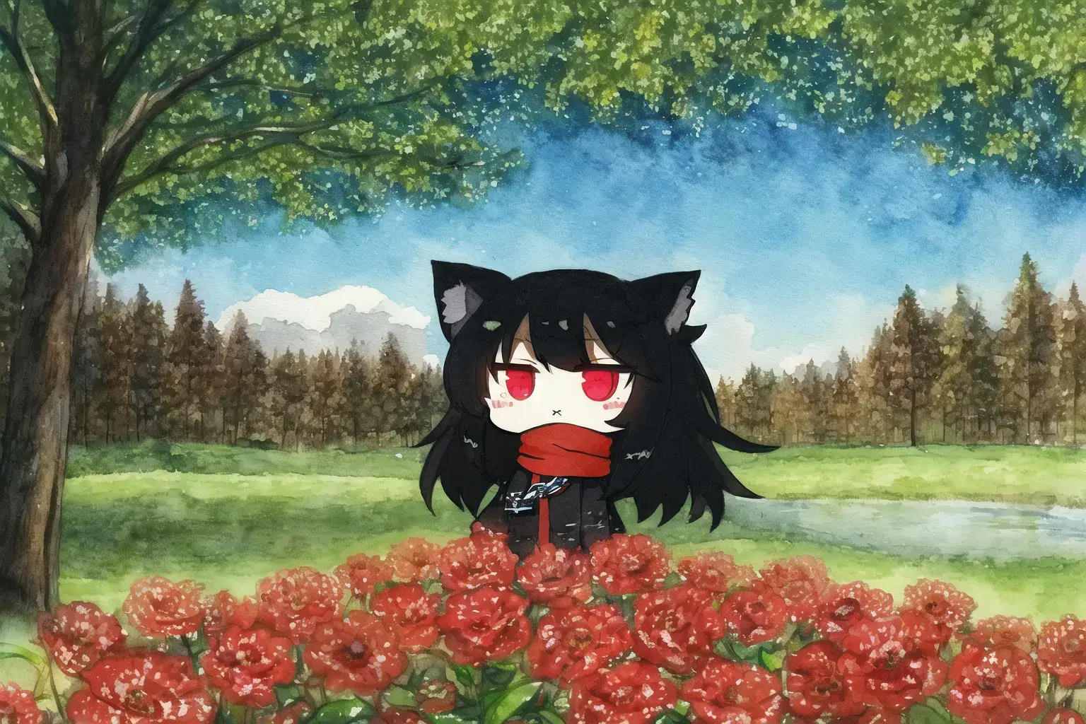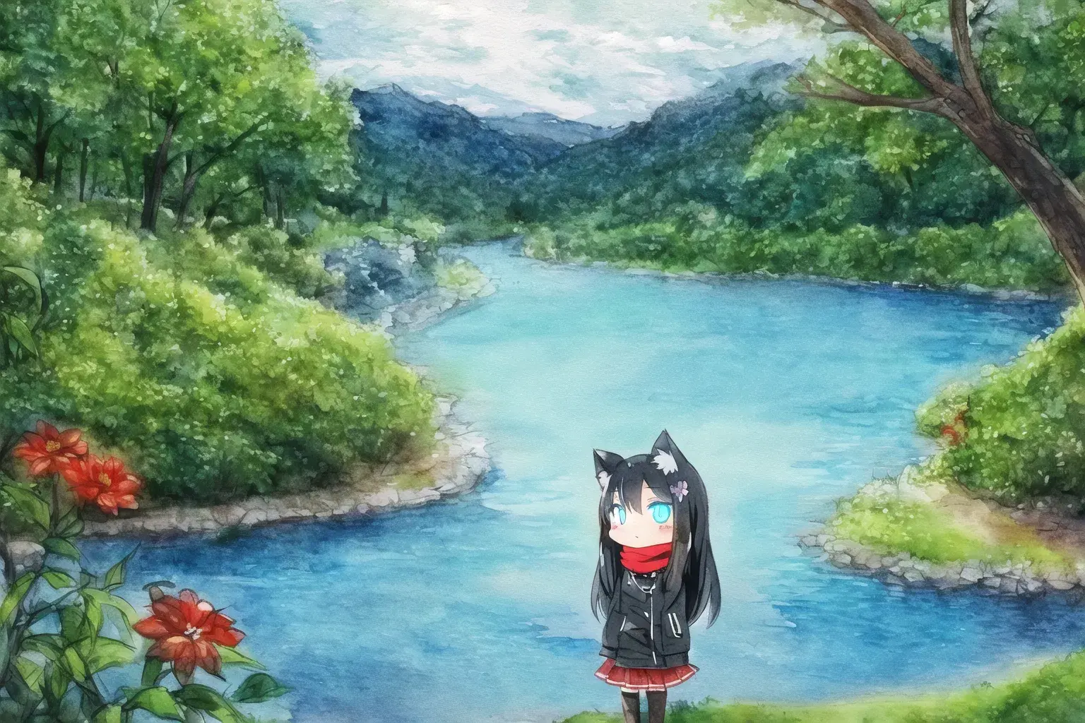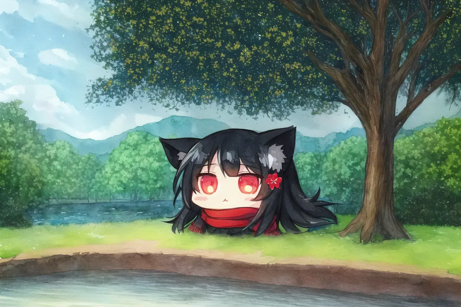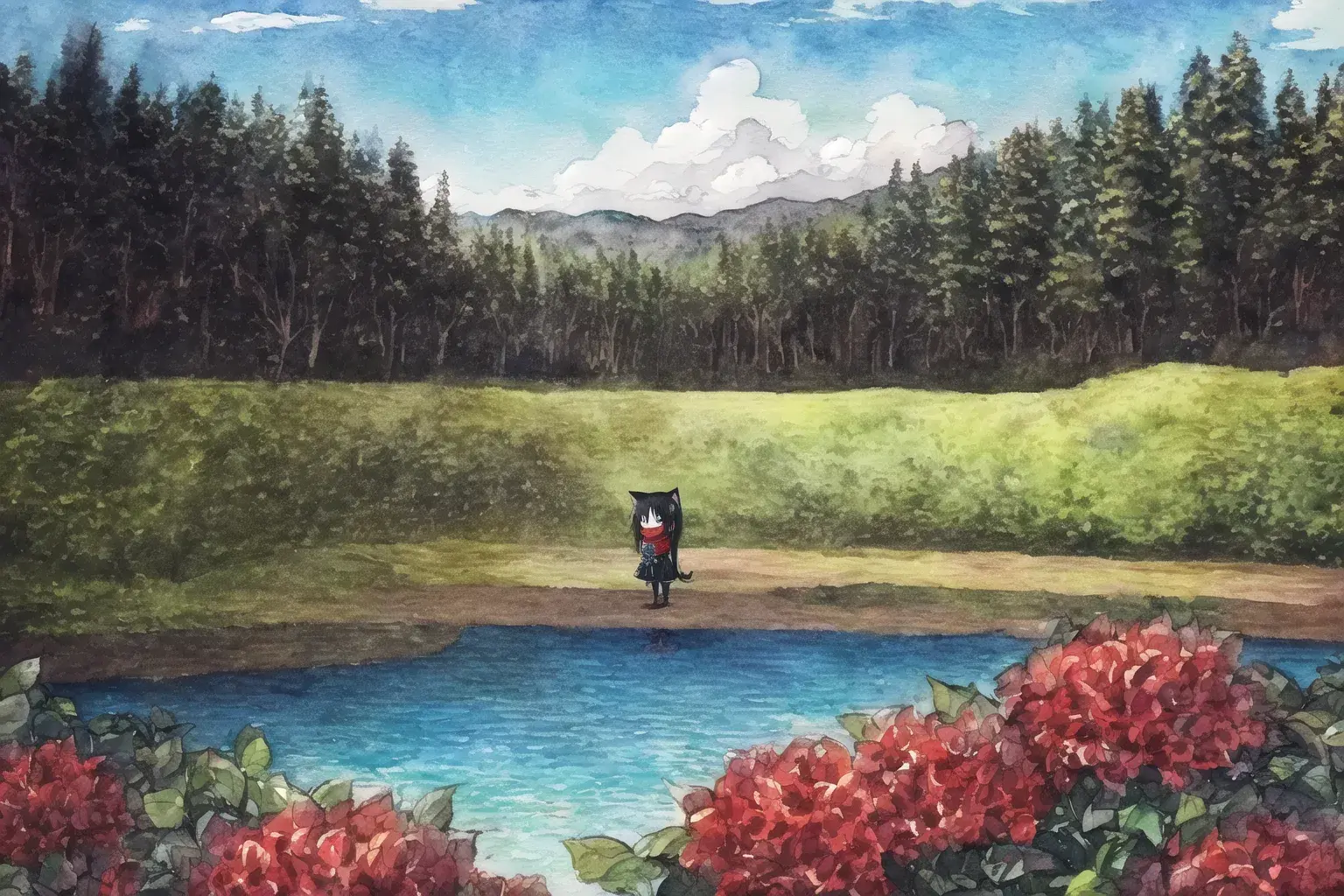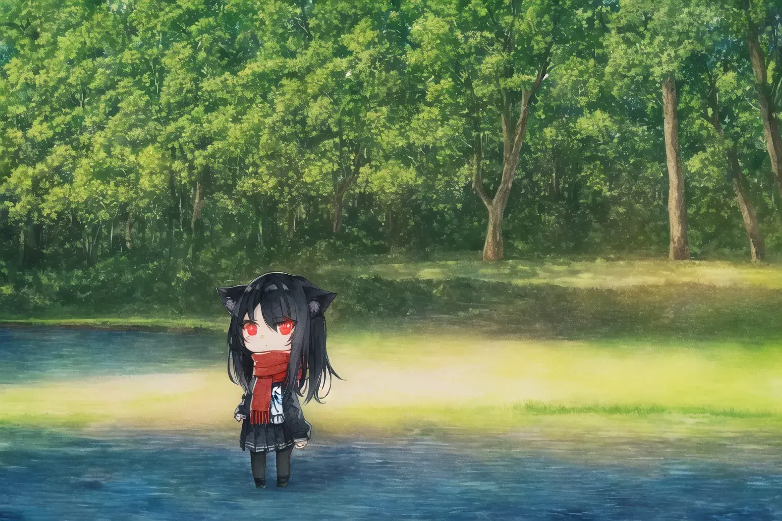 {river surrounded by trees},blue sky and cumulonimbus,{camping},Riverside,{in shadow},arbor,light reflecting in the river,tree shade, sunbeams