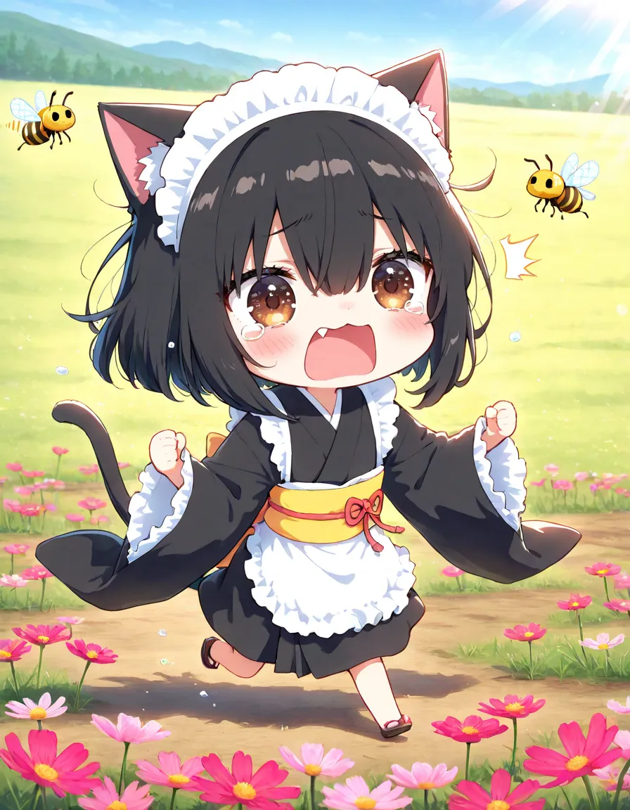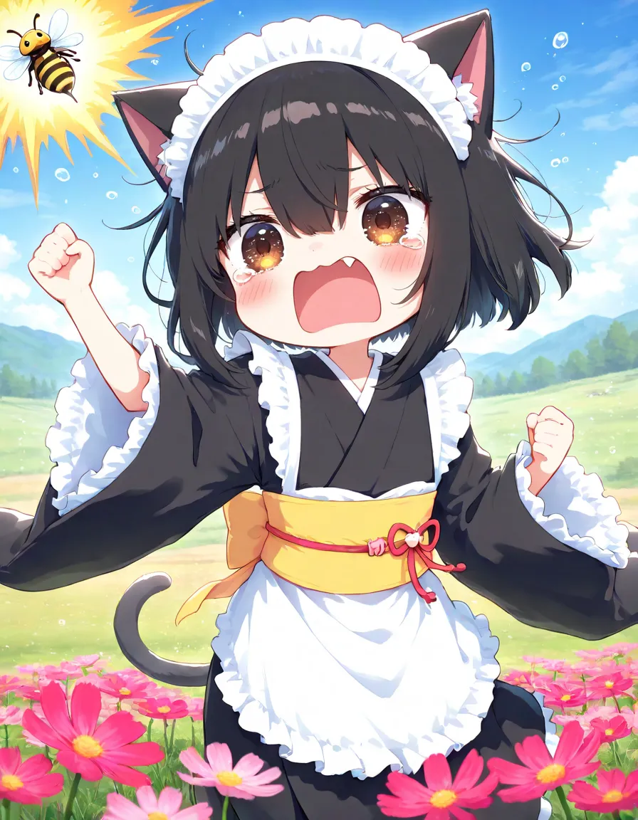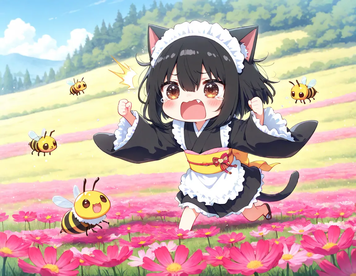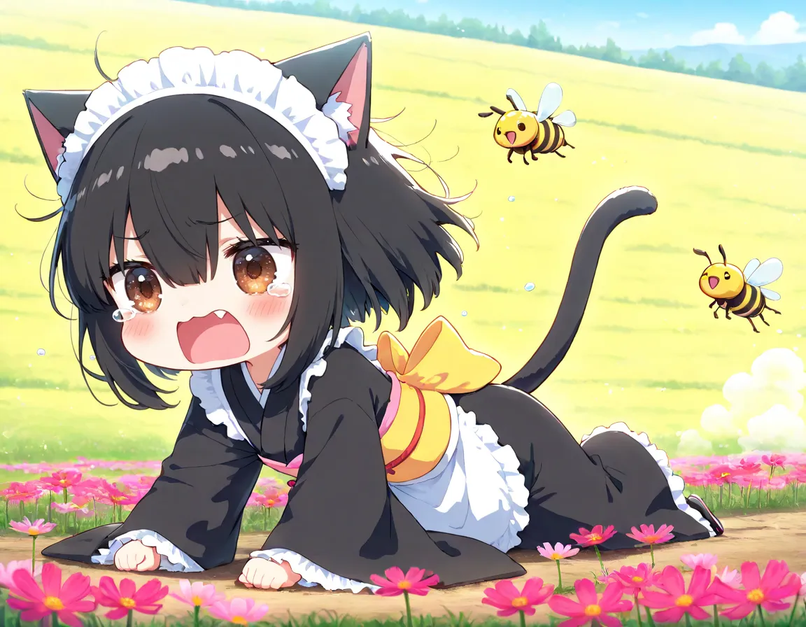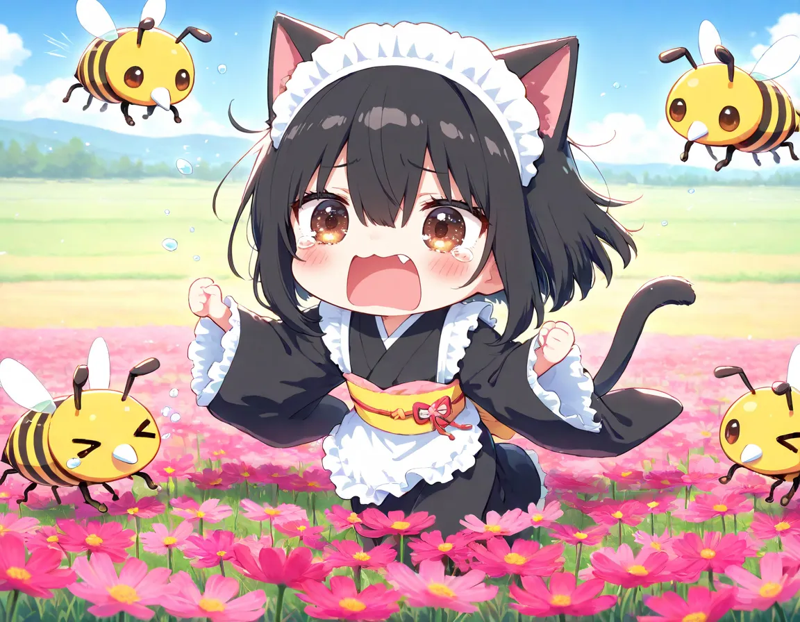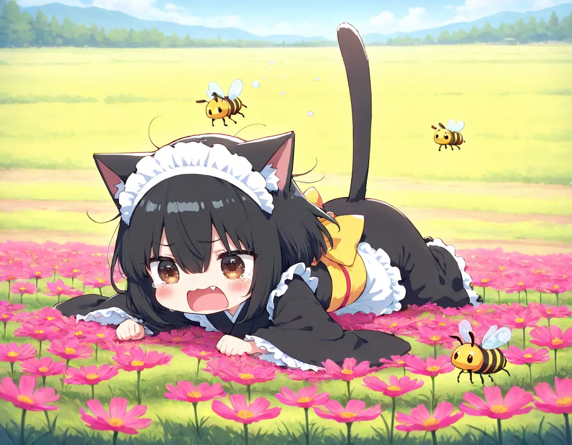 コスモスと戯れるかわいーヘタちゃんのはずが ハチ🐝さんが来てエラいことににゃったニャ〜(TOT)