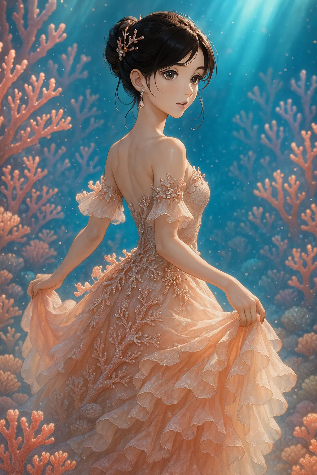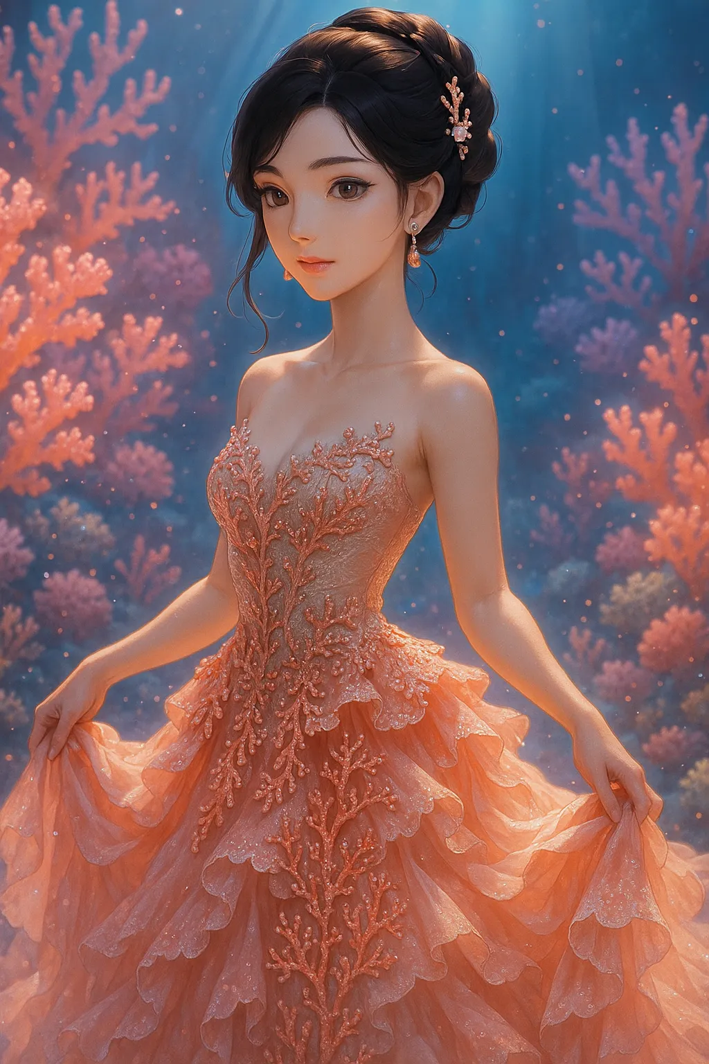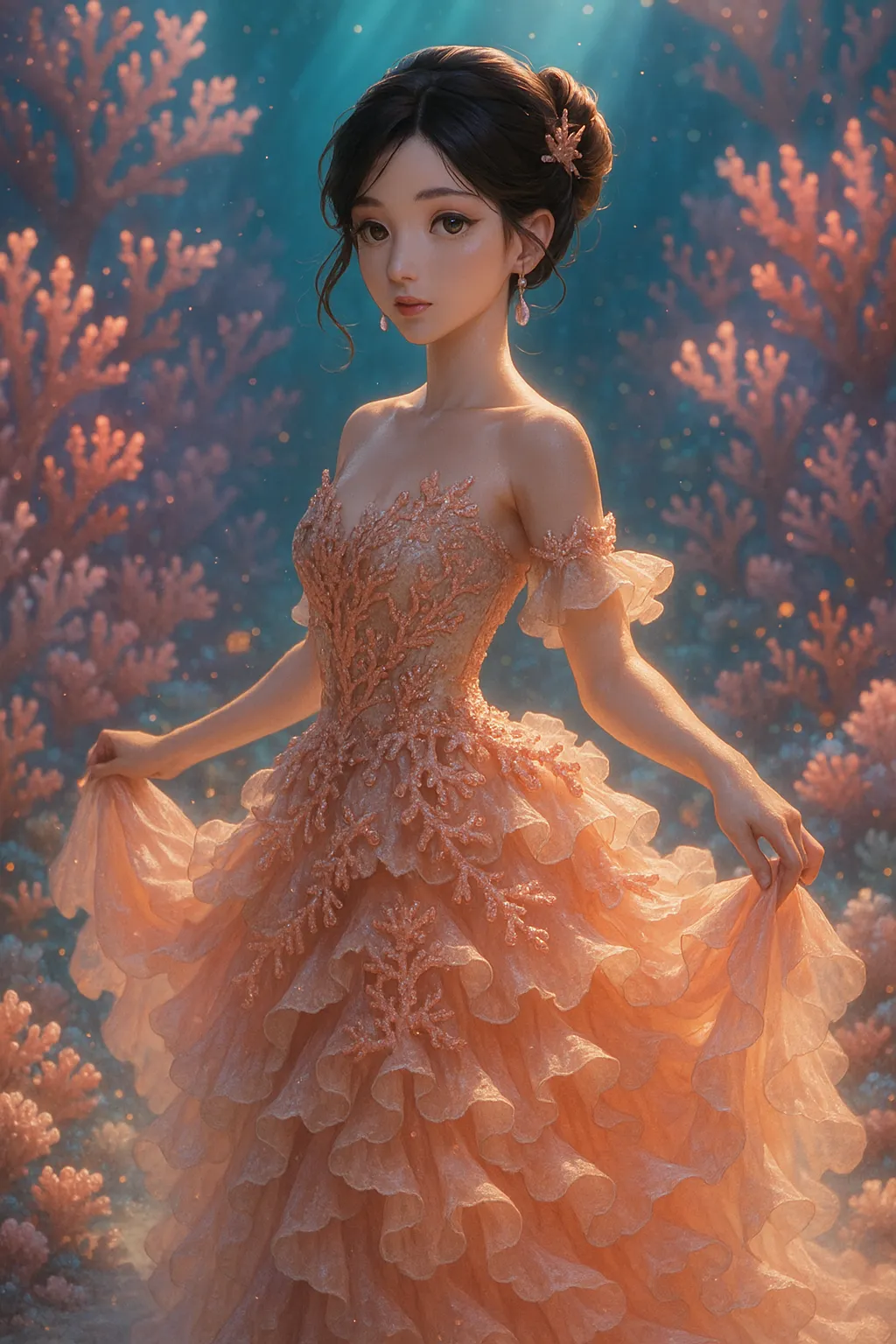 In the coral forest of the deep sea, a beautiful princess dons a dress mimicking pink coral and dances gracefully. Glowing particles surround her, evoking memories of a lost lover. At the secret underwater ball, she senses a new adventure, gently spreading her dress with a smile. What hidden treasure lies there? A fantastical moment that stirs the imagination.