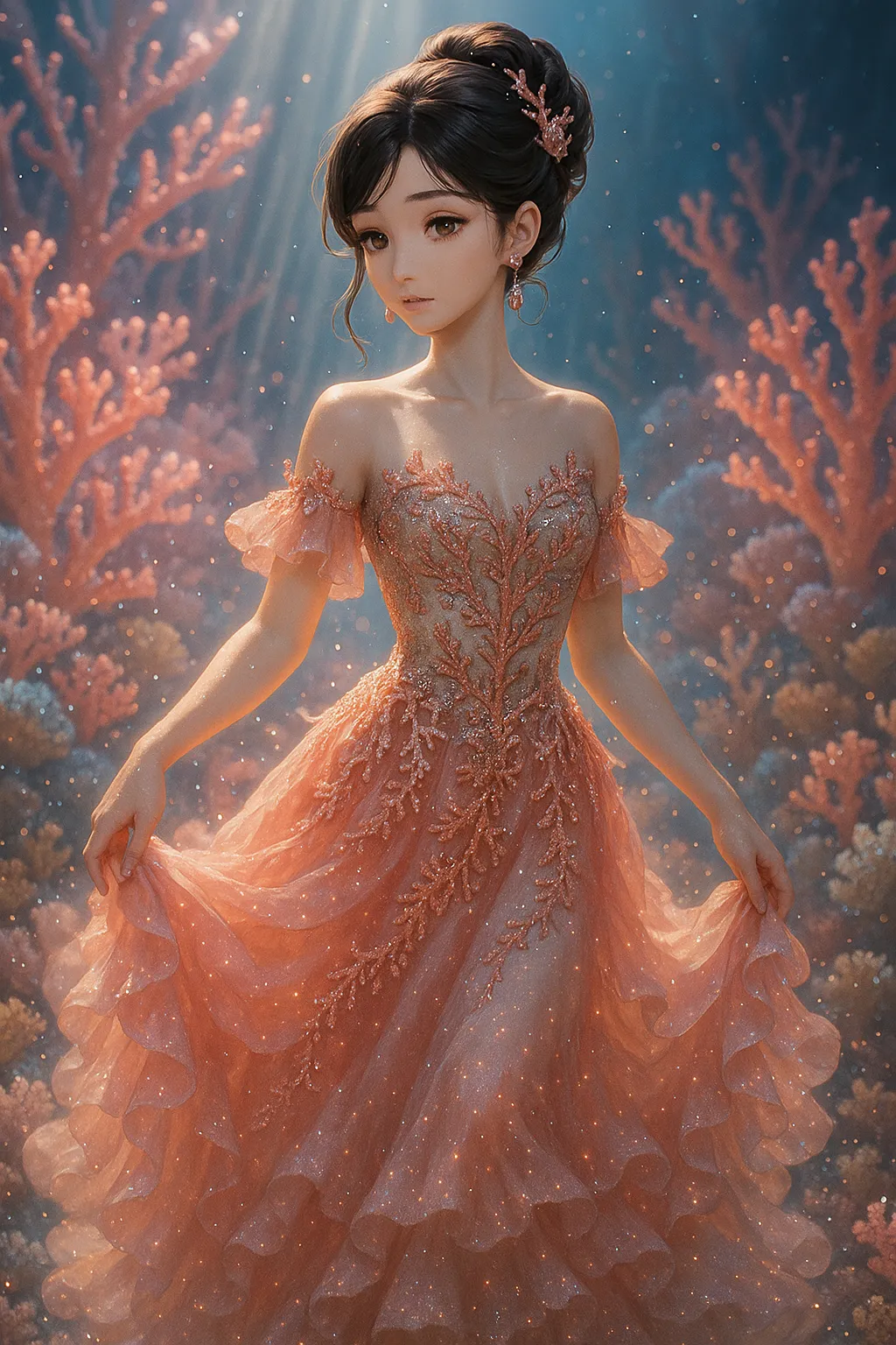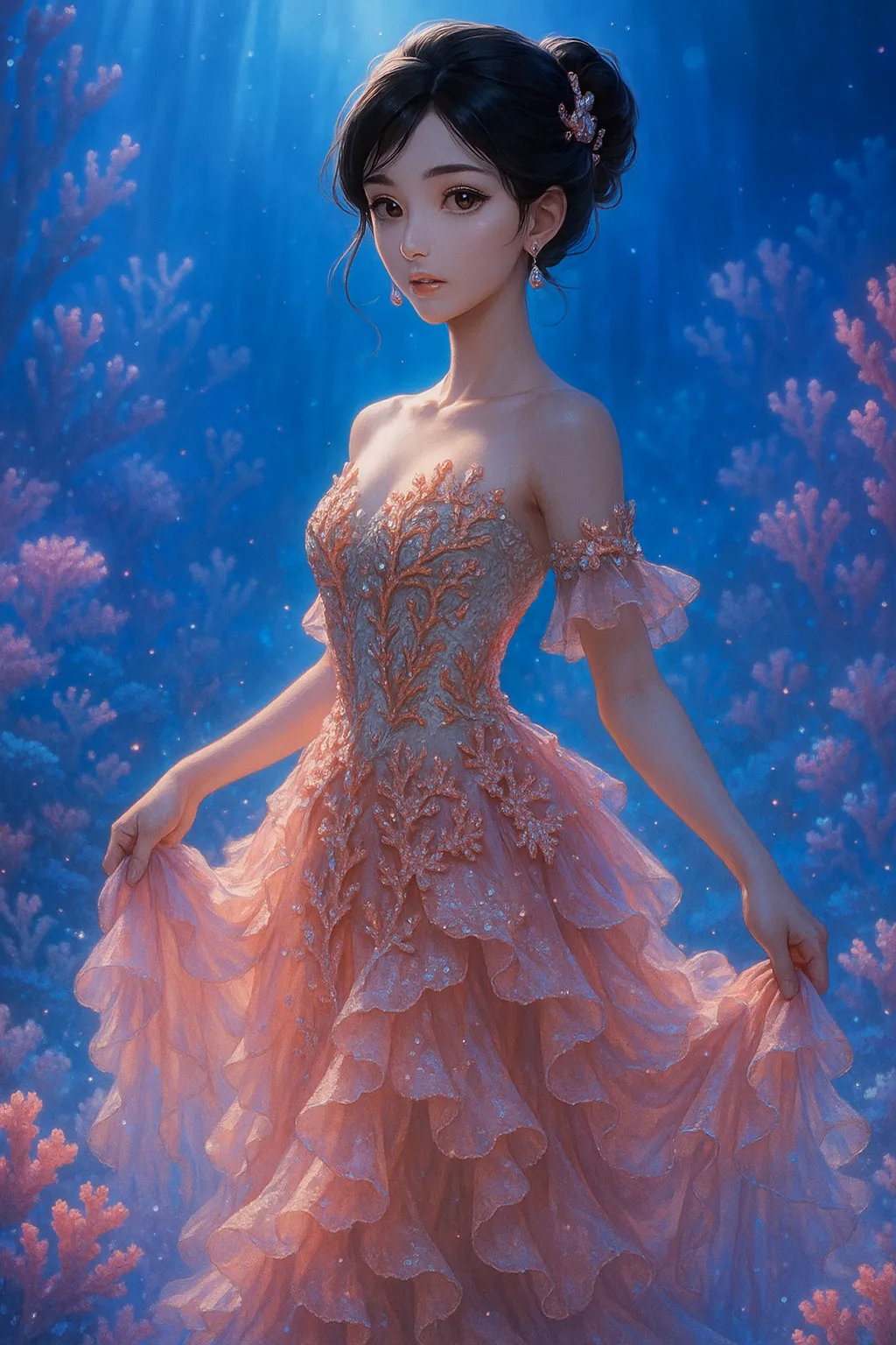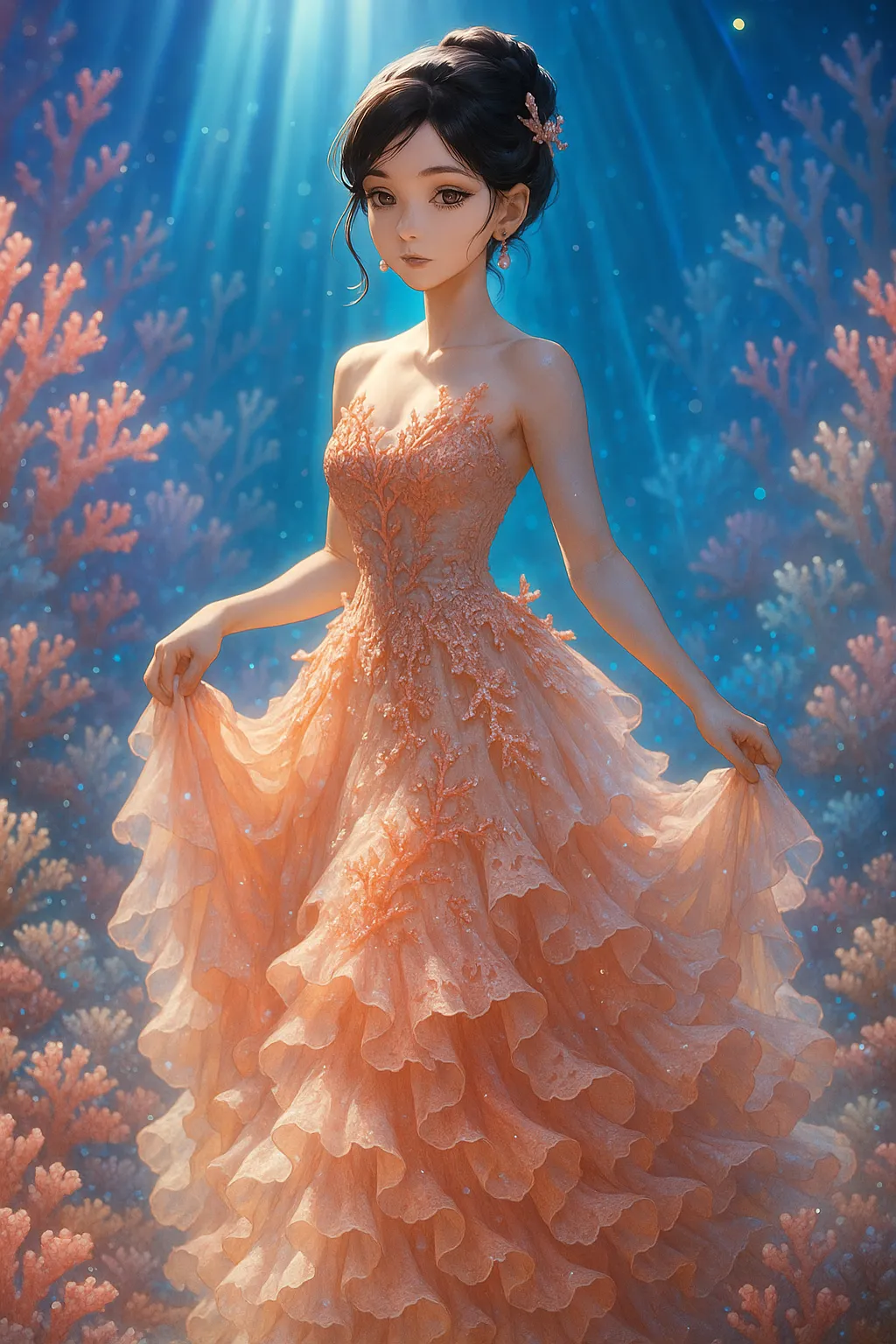 In the coral forest of the deep sea, a beautiful princess dons a dress mimicking pink coral and dances gracefully. Glowing particles surround her, evoking memories of a lost lover. At the secret underwater ball, she senses a new adventure, gently spreading her dress with a smile. What hidden treasure lies there? A fantastical moment that stirs the imagination.