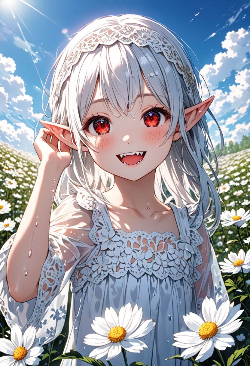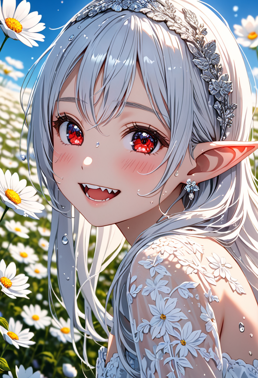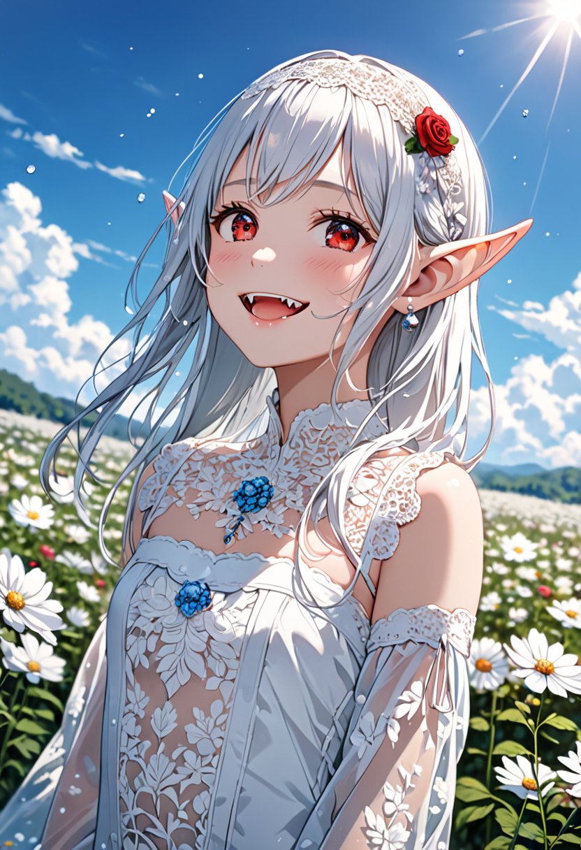 Smile of the Silver-Haired Elf in the Flower Field