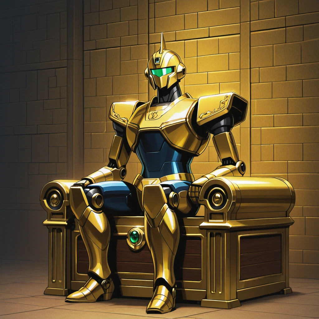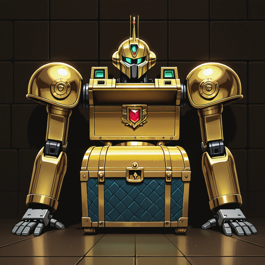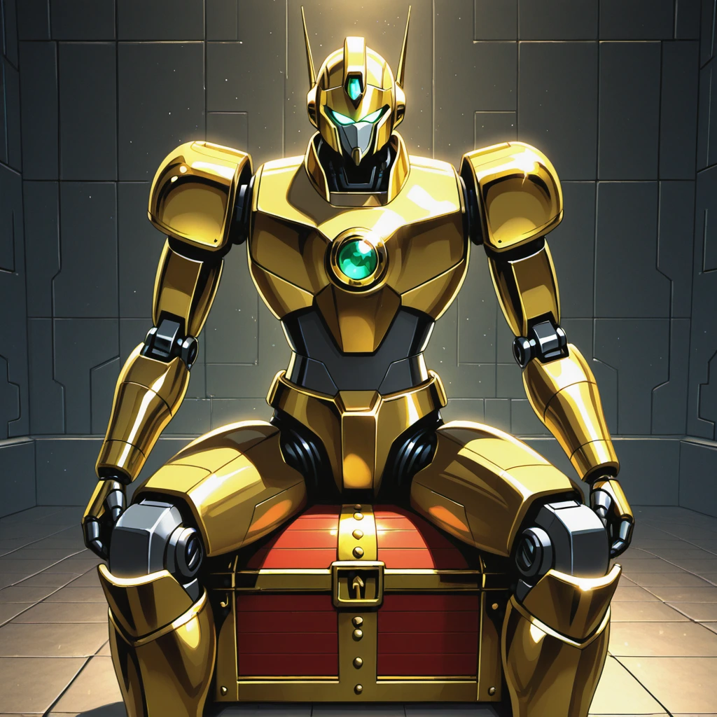 In the depths of an ancient ruin, a golden robot sits upon a red treasure chest, its green core glowing in the chest. As the guardian of a lost civilization, it has protected secrets for centuries. If an intruder appears, the moment of awakening arrives. Adventurer, what story does this robot's gaze tell? Is the chest's content glory or a curse? A scene that stirs the imagination with a quiet confrontation.