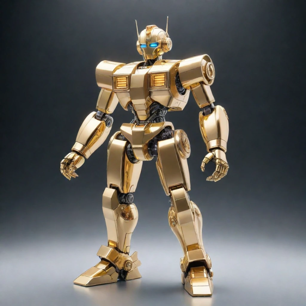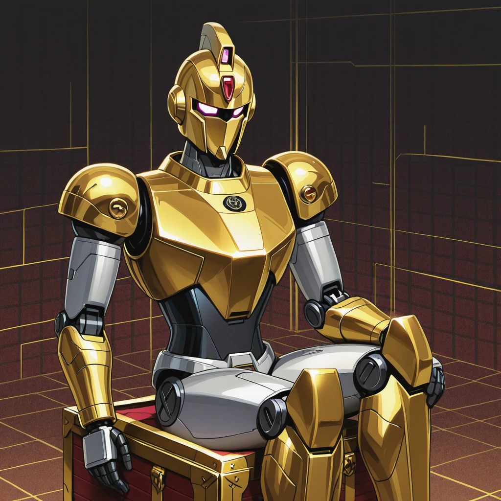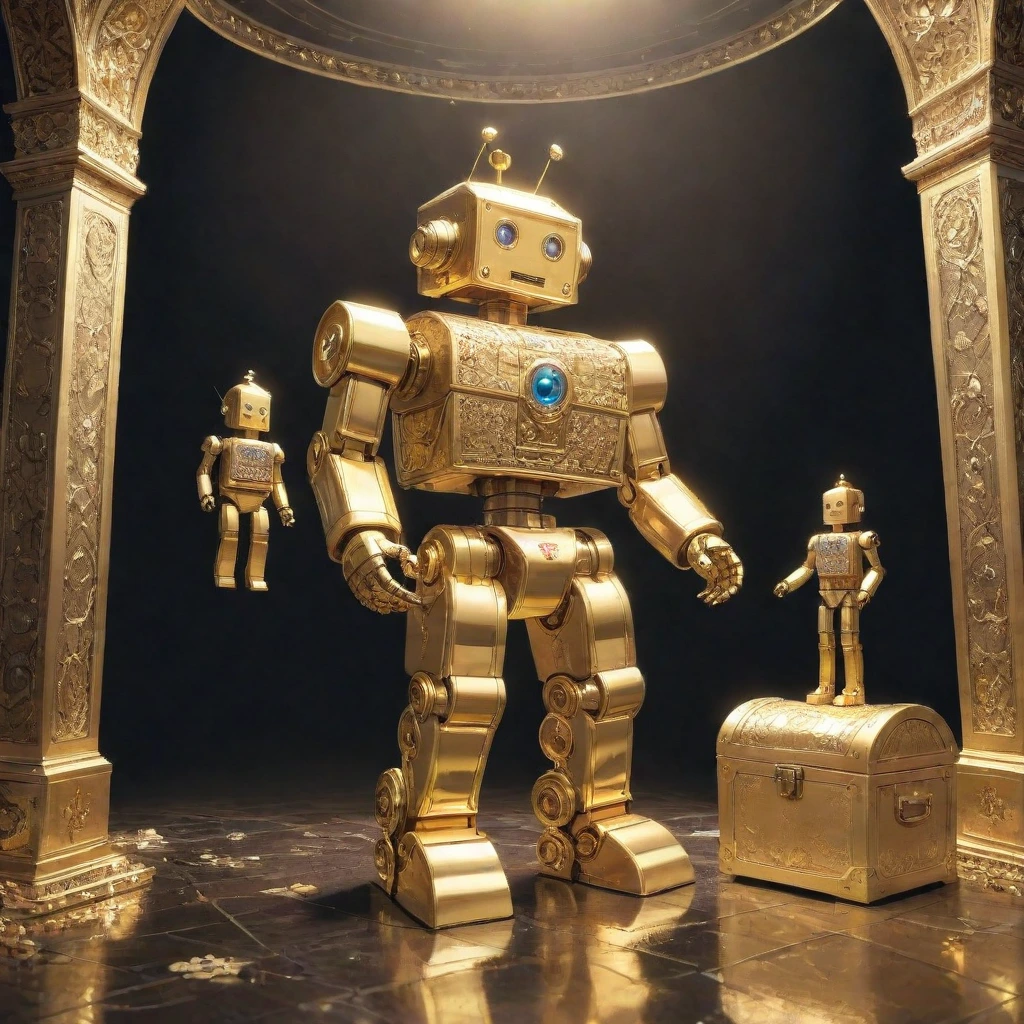 In the depths of an ancient ruin, a golden robot sits upon a red treasure chest, its green core glowing in the chest. As the guardian of a lost civilization, it has protected secrets for centuries. If an intruder appears, the moment of awakening arrives. Adventurer, what story does this robot's gaze tell? Is the chest's content glory or a curse? A scene that stirs the imagination with a quiet confrontation.