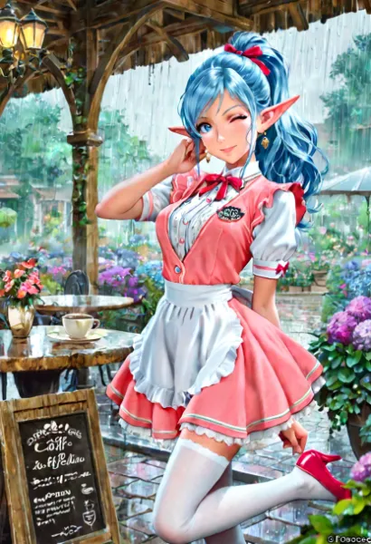 In a quaint cafe on a rainy street corner, a blue-haired elf girl stands at the counter. Dressed in a pink maid outfit, she brews a special cup of coffee. Her daily life is an adventure woven with small encounters with visitors. Amid the gentle patter of rain, her smile warms the heart. Perhaps this cup marks the start of a new story? A snapshot of such a fantastical moment.