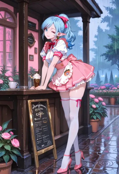 In the rainy back alleys of a cyberpunk city, an elf-like girl with blue and pink hair stands still. Under the flickering neon signs, she seems to be waiting for something. Clad in a black gothic dress, her blue eyes reflect the city's glow. Could this be the start of an adventure to find lost memories, or a hint of forbidden love? As the rain whispers her heart's secrets, will you approach her?
