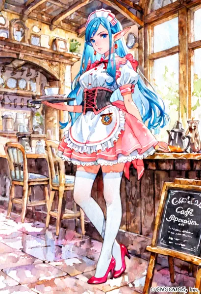 In a sunlit cafe by the window, a blue-haired elf girl sits gracefully. Dressed in a white maid outfit, she savors the parfait in her hand, her eyes reflecting a peaceful joy that forgets the hustle of daily life. During a secret break amid adventures, the sweet dessert becomes her little escapade. With the greenery swaying outside, she gathers strength for the next story. Readers can't help but ponder her backstory.
