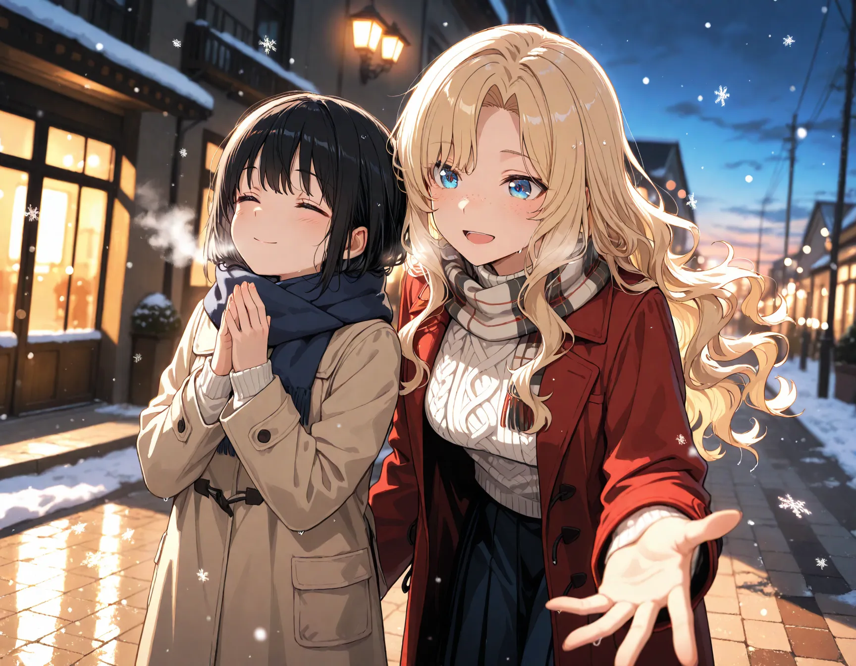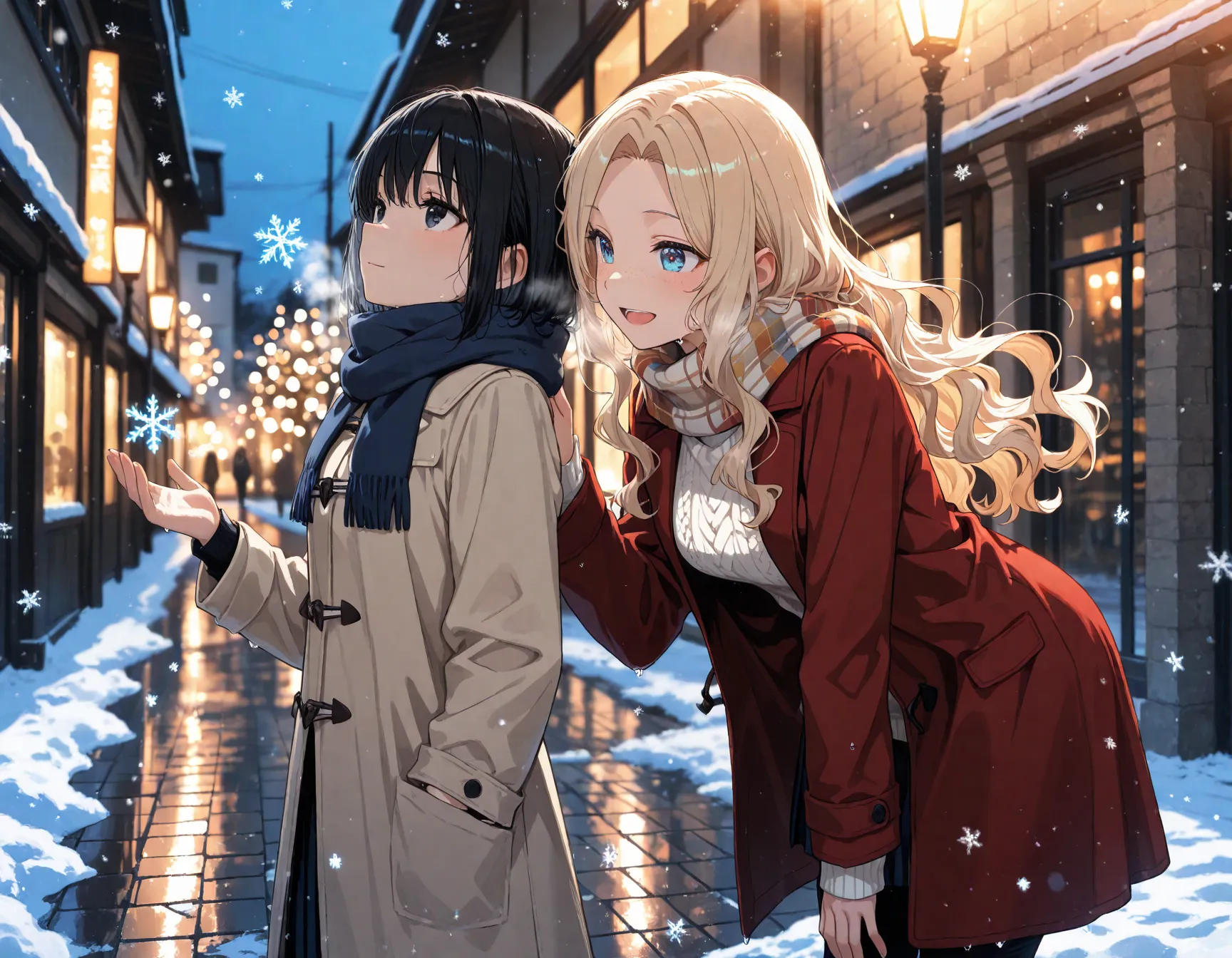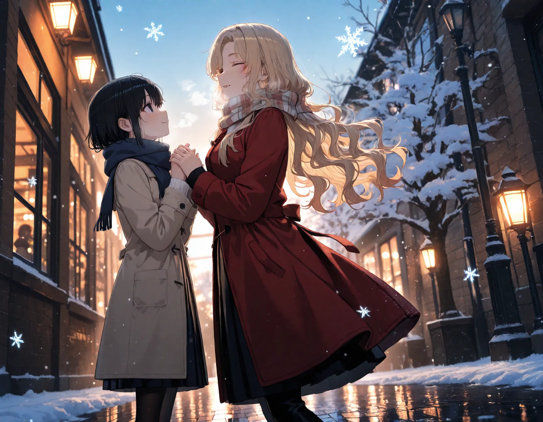 parameters: 2girls, height difference, masterpiece, best quality, highly detailed, winter scene, first snow falling, evening light, soft lighting, cinematic composition,