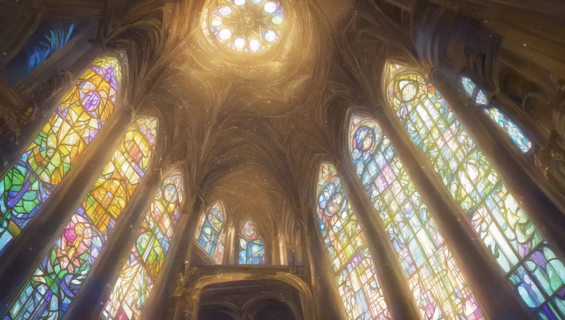 「ファンタジー」「教会の中、大きな十字架」「バロック様式」「神の光」「複雑な」「ステンドグラス、天窓」「神聖な、聖なる、女神」