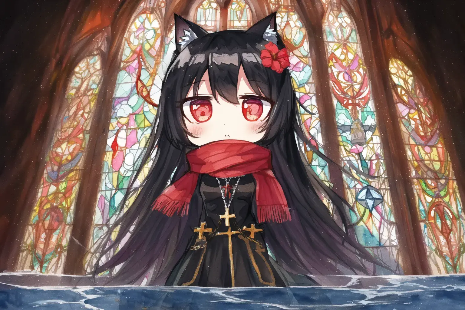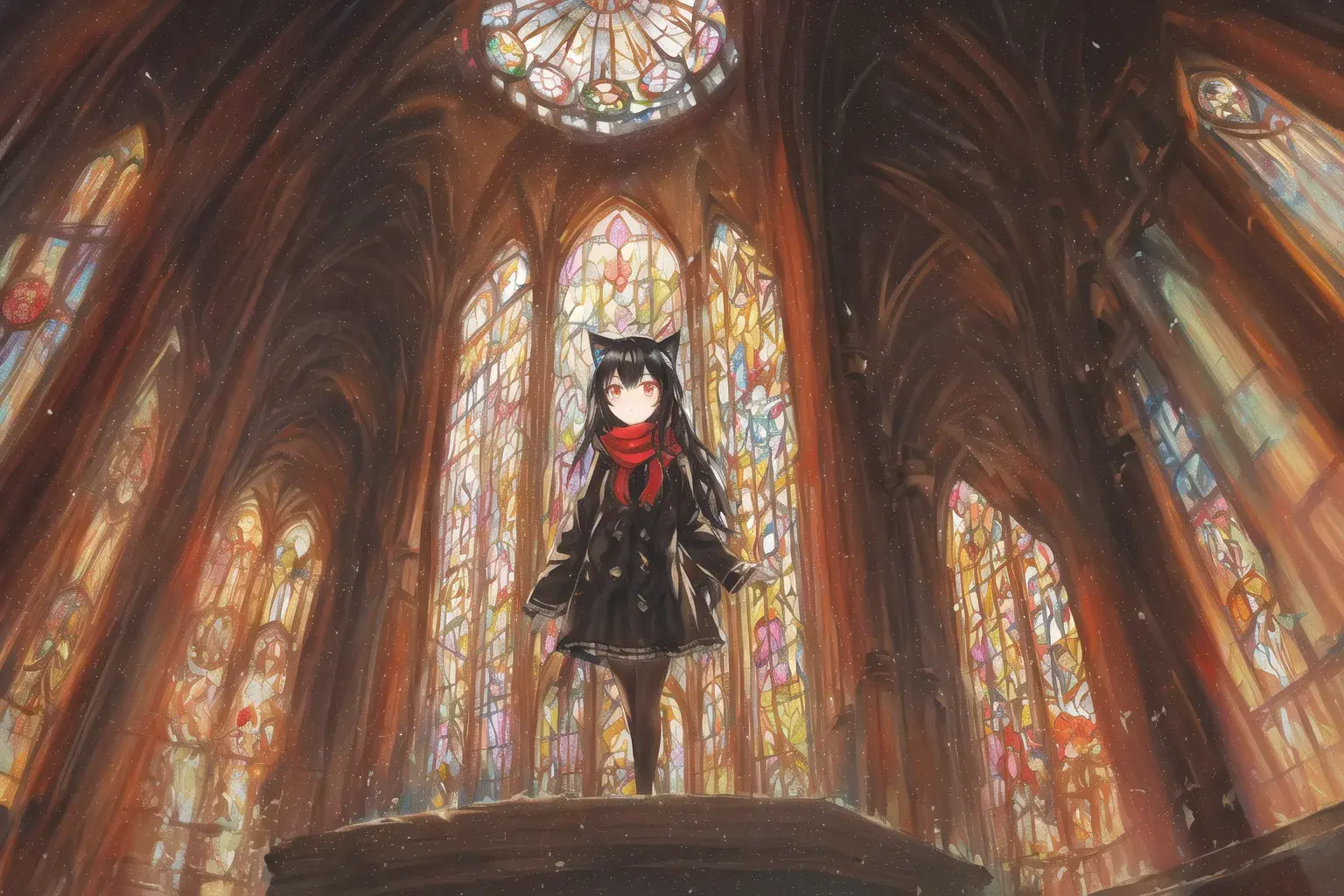 {fantasy},{in church,large cross},{baroque},God Light,{intricate},Stained glass,skylight,{divine,Holy,goddess}