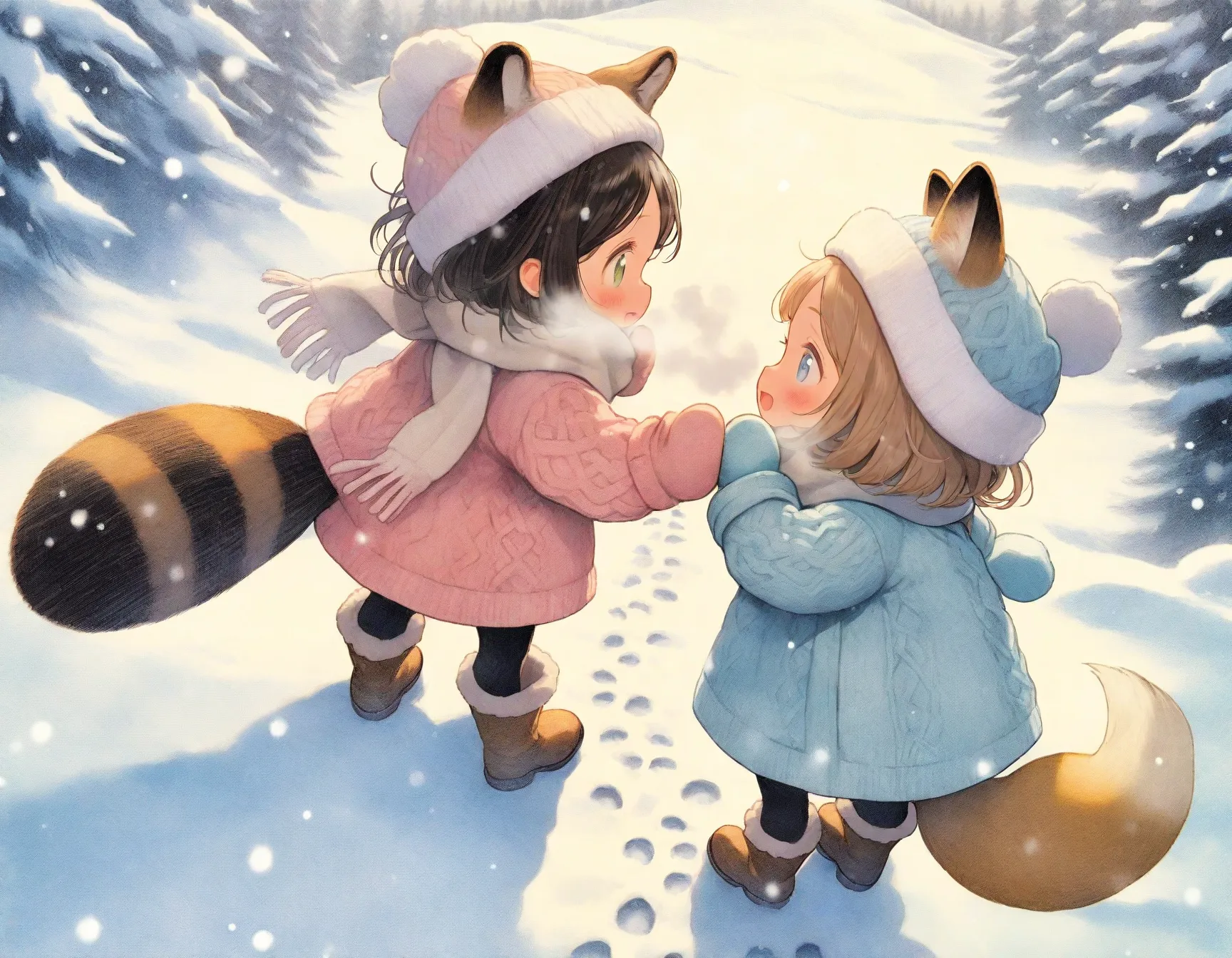 snowy forest, rural mountain, animal footprints in snow, soft shadows, depth,