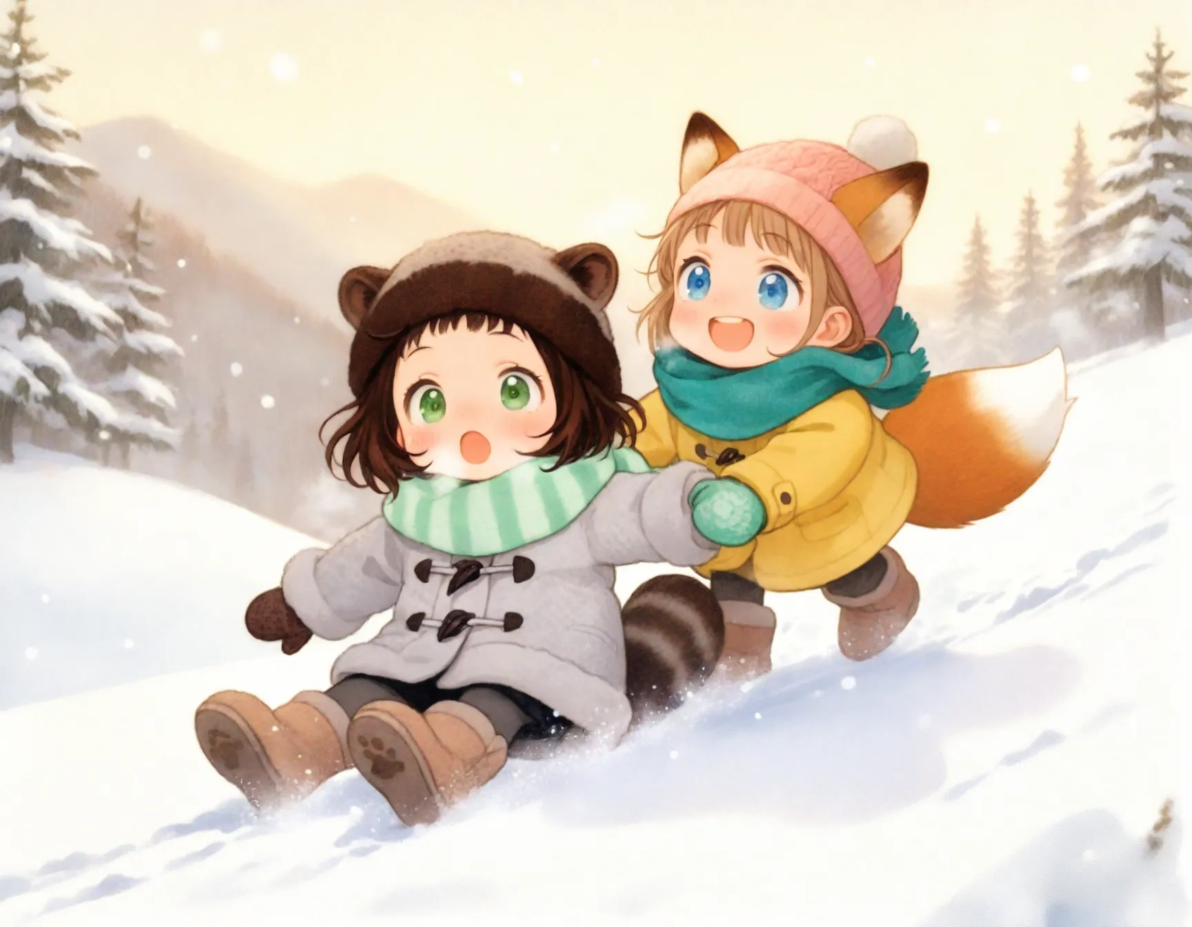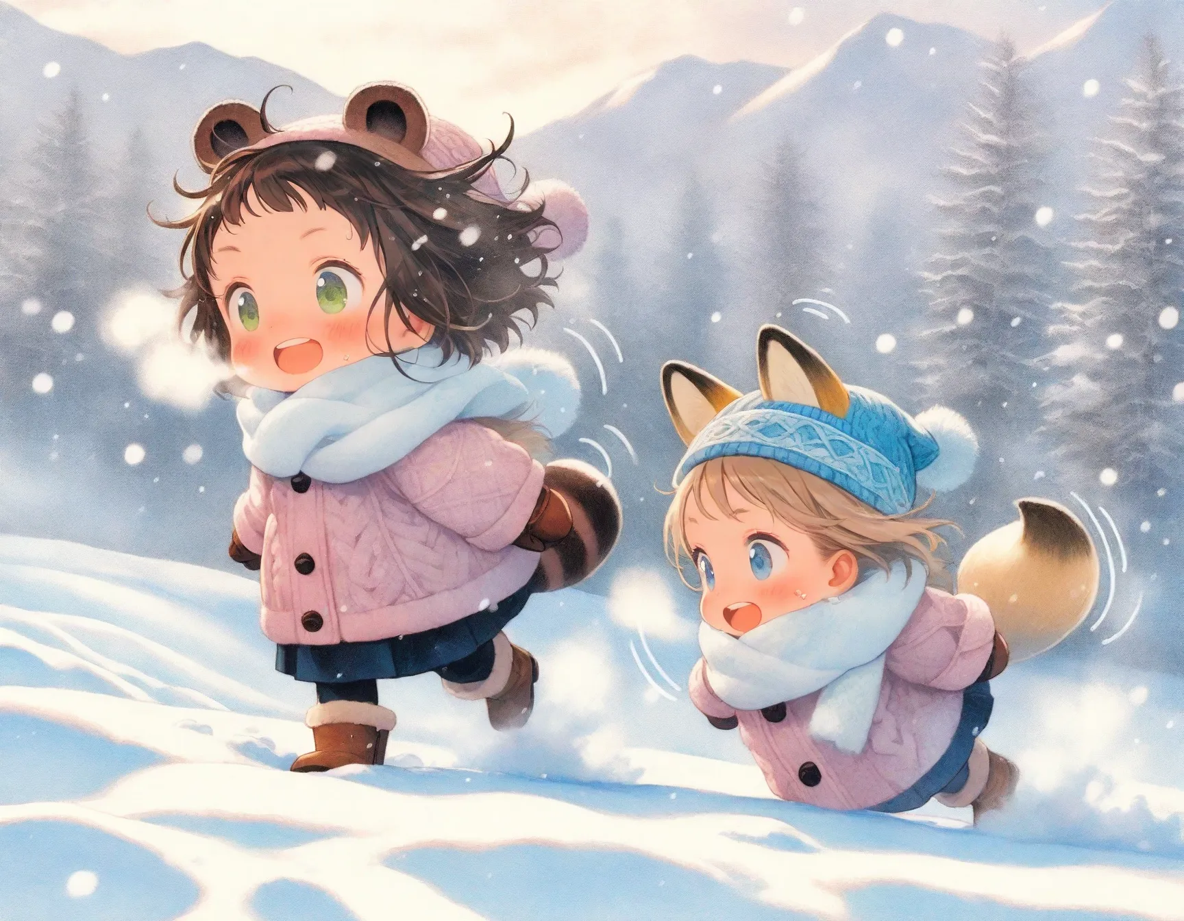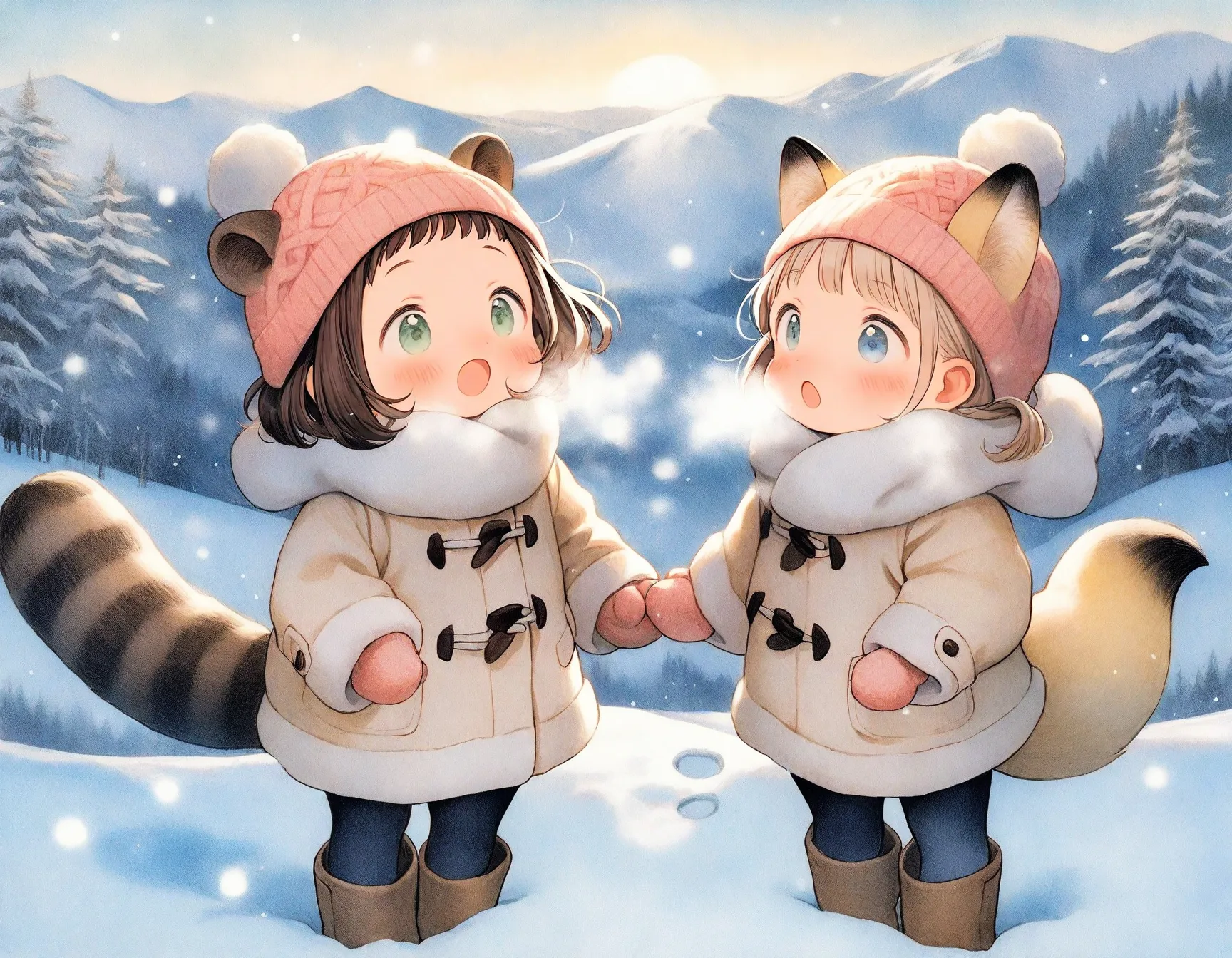 snow spray, sparkling snow, soft morning light, breath vapor, dynamic pose,