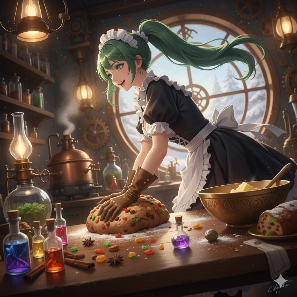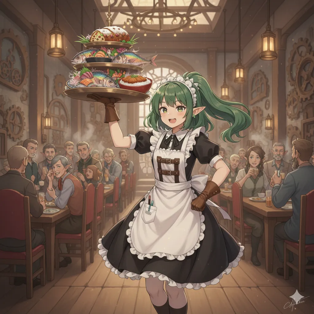 魔導スチームの駆動音が心地よく響くキッチンで、ドワーフの美食の神官戦士にして料理人、チェルキーは鎧を脱ぎ、代わりにフリル付きのメイド風エプロンドレスを身に着けていた。