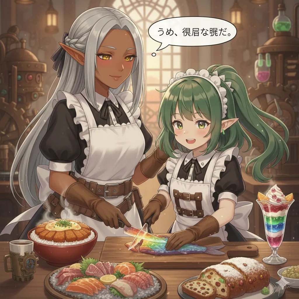流れるような手つきで盛り付けられた刺身は、異世界の石器を模したかのような、しかし東方の美意識にも通じる見事な皿の上に。七色の光を放つ切り身、横には透き通った別の魚の刺身も添えられ、その完璧な職人芸は見る者を圧倒した。