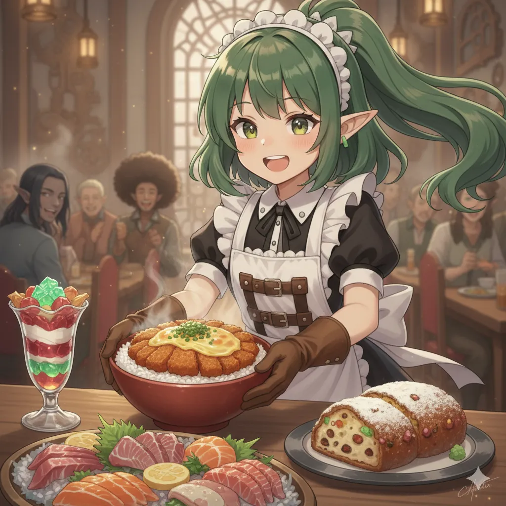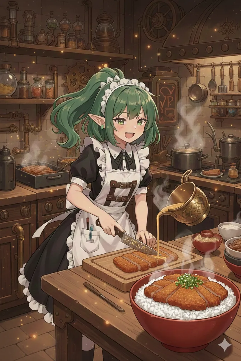 彼女が視線を送ると、空中を浮遊する真鍮製の魔法鍋が、煮詰めた秘伝の出汁と溶き卵の餡を、一つ目のどんぶり(ごはんの上にカツが鎮座している)へと自動で注ぎ始めた。