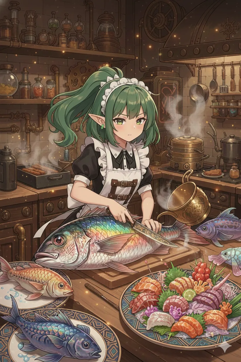 カツ丼の時とは一変、集中力は極限に達している。彼女の握る魔導包丁の刃が閃き、三枚におろされた魚のサクは、まるで水が流れるかのように、見事な薄切りとなっていく。