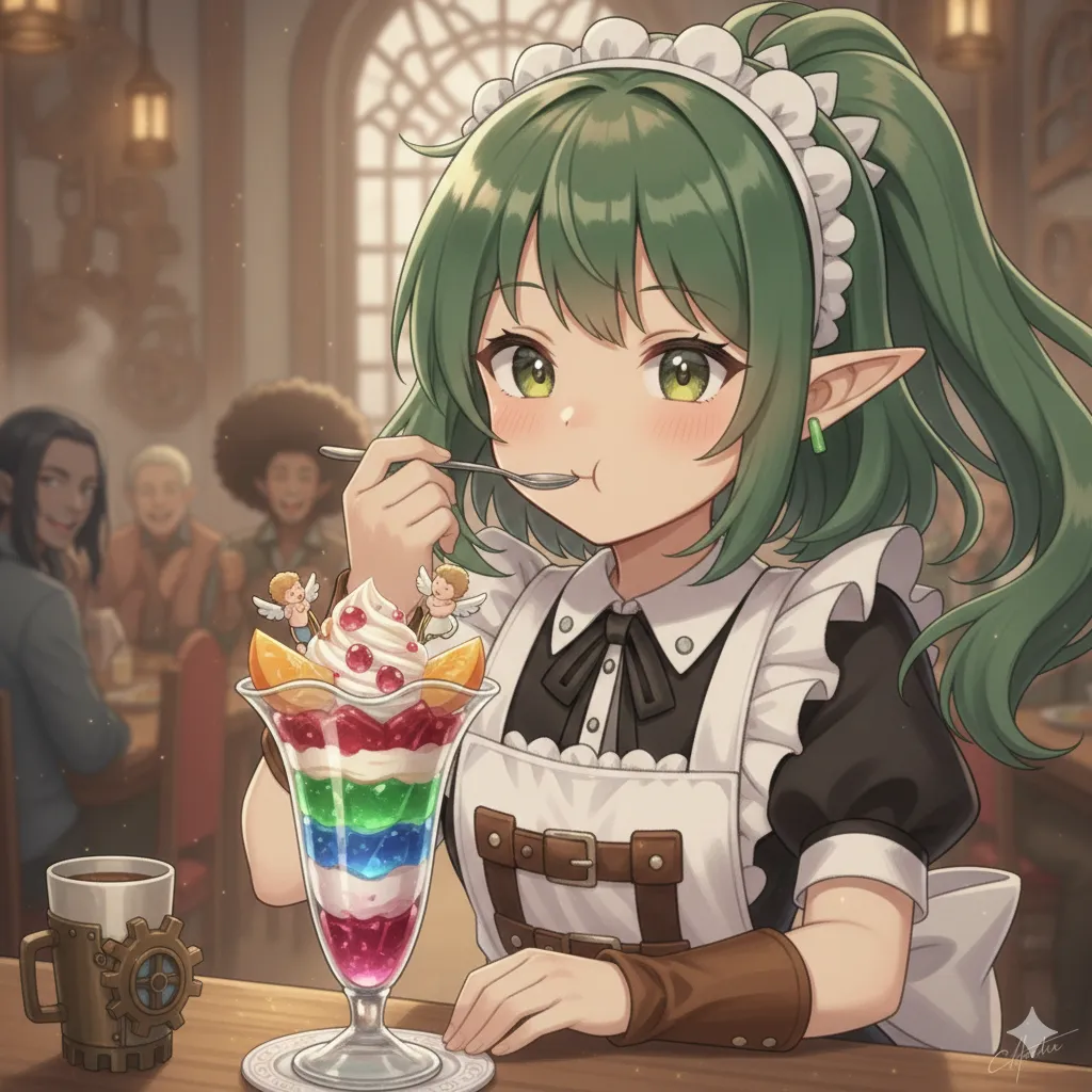 「ふぅ、賄いだよ。お客さんにいただいた『宝石のように輝く魔法のゼリー・パフェ』…自腹じゃなくて本当に良かった」