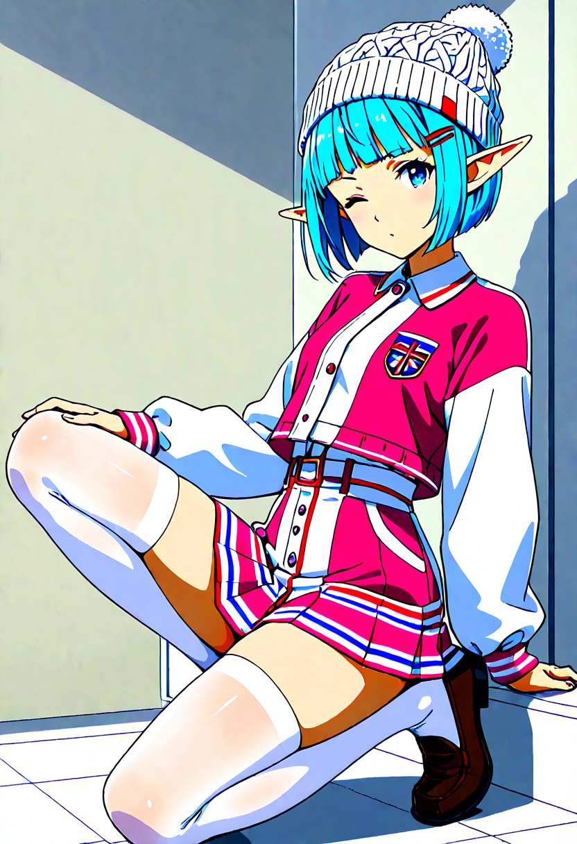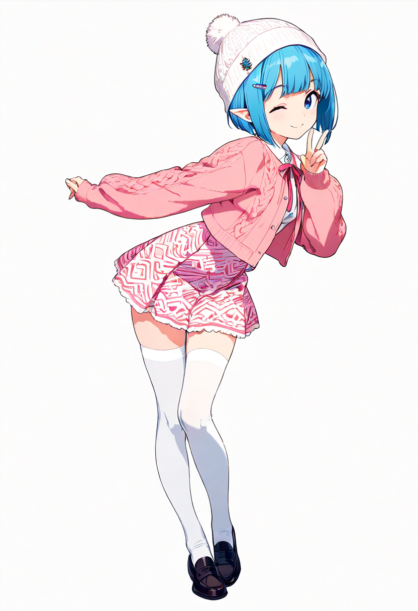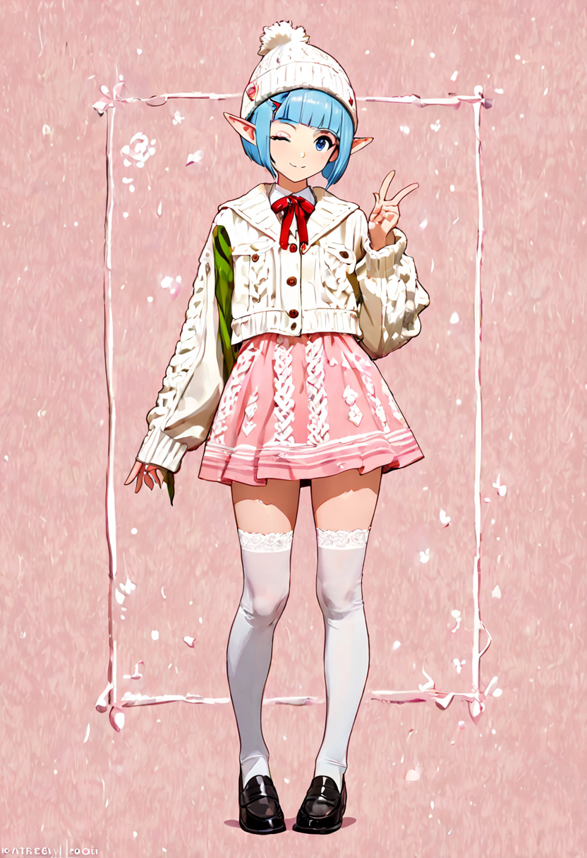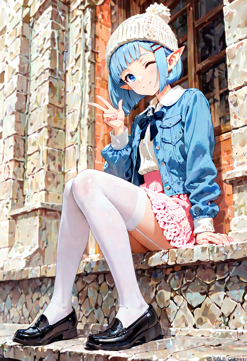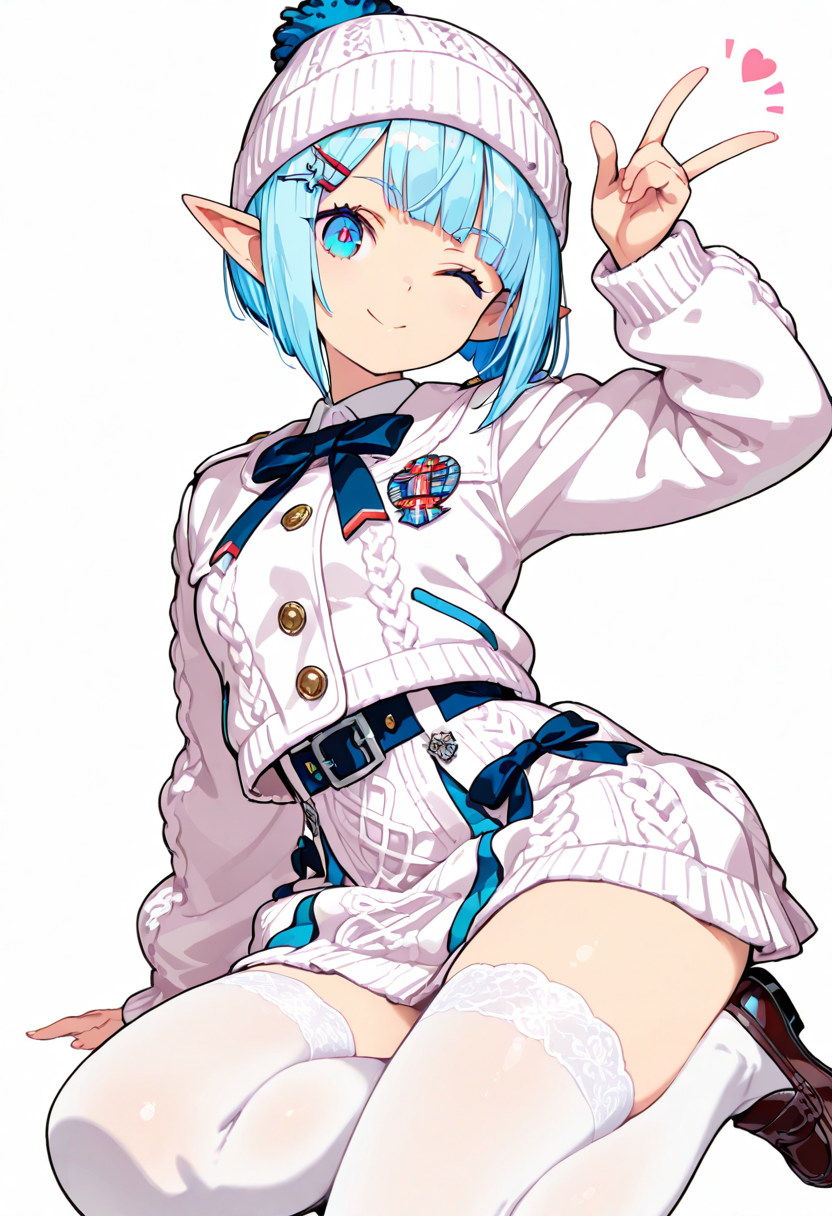 In a snowy street corner, a blue-haired elf girl sits with a fluffy hat and pink skirt fluttering. She makes a heart-shaped peace sign. She's a fairy who wandered into the human world, strolling the streets daily in search of kind encounters. Today, she poses with secret magic to deliver a smile. Her eyes reflect winter adventures, perhaps warming your heart?
