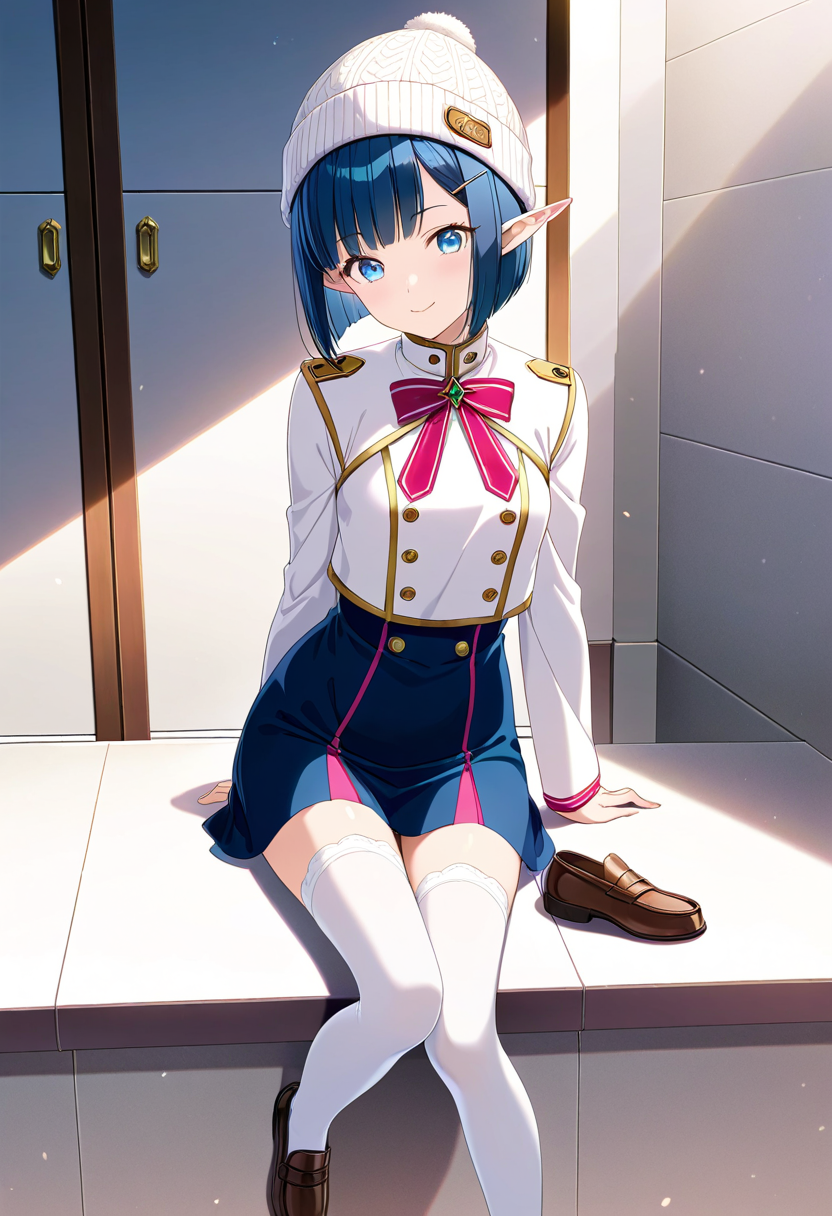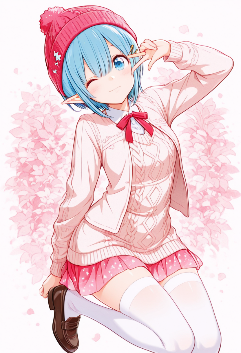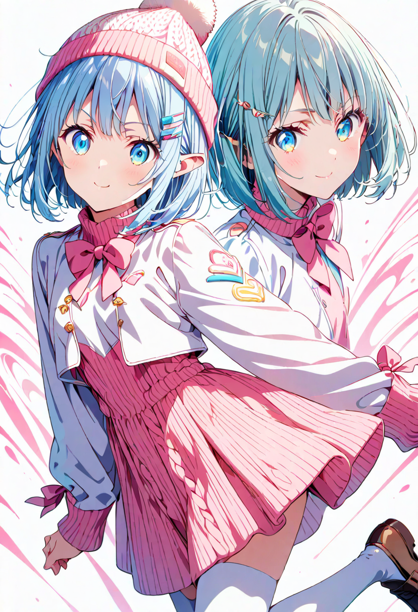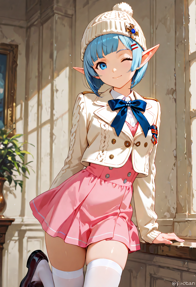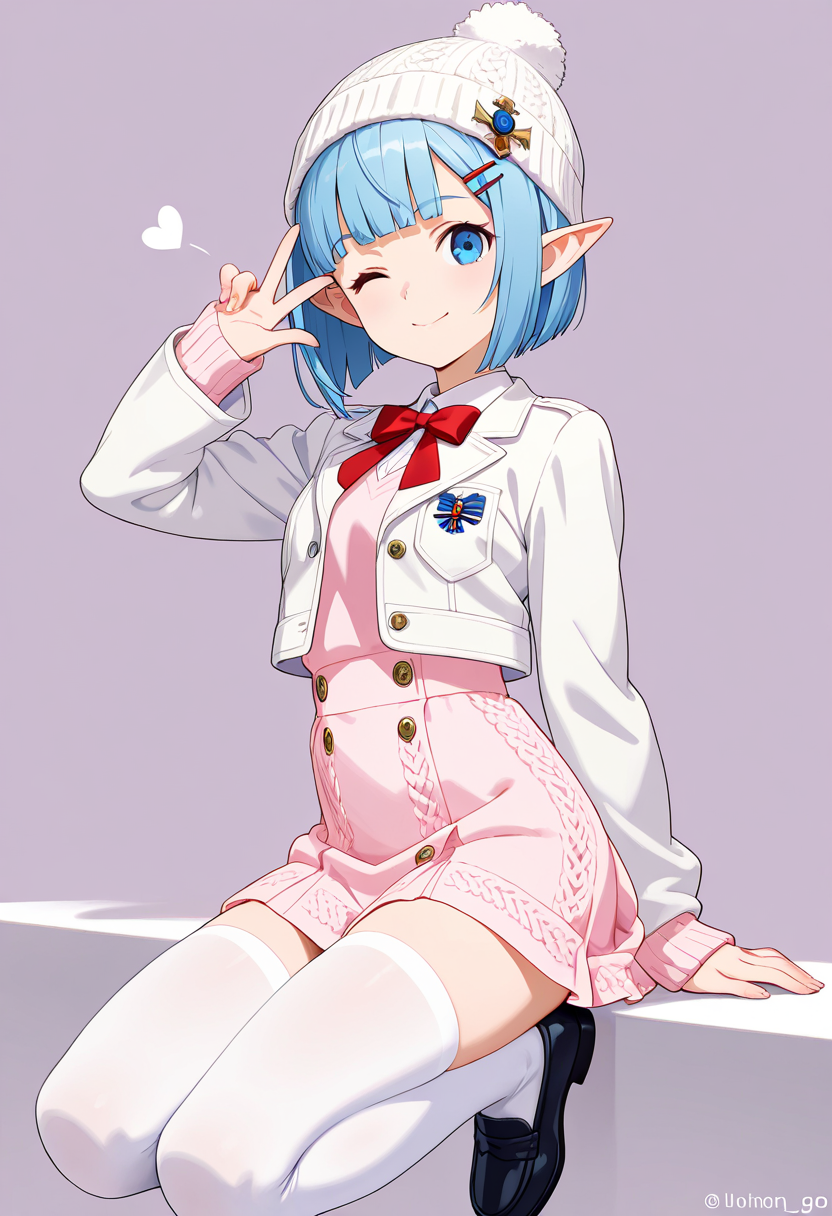 In a snowy street corner, a blue-haired elf girl sits with a fluffy hat and pink skirt fluttering. She makes a heart-shaped peace sign. She's a fairy who wandered into the human world, strolling the streets daily in search of kind encounters. Today, she poses with secret magic to deliver a smile. Her eyes reflect winter adventures, perhaps warming your heart?