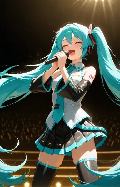 parameters: 1girl,vocaloid, megurine luka,athlete body,large breasts,Singing passionately,sweat,outdoors, on stage,lightimg,steel frame, audience, crowd,starry sky,steel frame, audience, crowd, city night view in the background,
