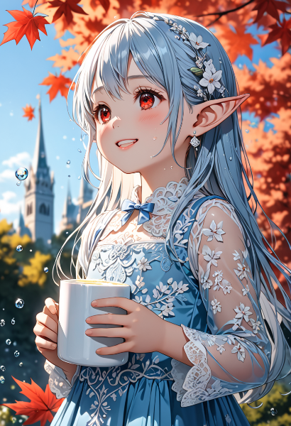 parameters: 8K resolution,(cinematiclight,masterpiece,best quality,Ultra extremely detail everyone ,perfect anatomy,high-resolution,highres,extremely detailed,sharp focus),((high-contrast:1.6,strong down-light, flower print)) ,((extreme from_below:1.5,cute child elf wearing outfit light-yellow-suit with sheer fabric,embroidered with white vine-like lace, with sleeves and brilliant sequins, white unserwear, light blue gown),((best detailed red Eyes reflection)), (messy platinum-white long hair colored inner hair),elf ear with big red earrings ,wetting face,tilt,cheek,blush,enough lip with lipstick and wet,Skin Gloss and skin is soaking wet, wet-lip:1.5,big hip,small breasts,Skin Gloss at legs,smile,mouth wide open, BREAK, (((chai, hot Milk tea))) ,warm evening light, soft breeze,Bubbles, maple trees, <lora:hohoaka:1> <lora:make25d_type1_v100:1>