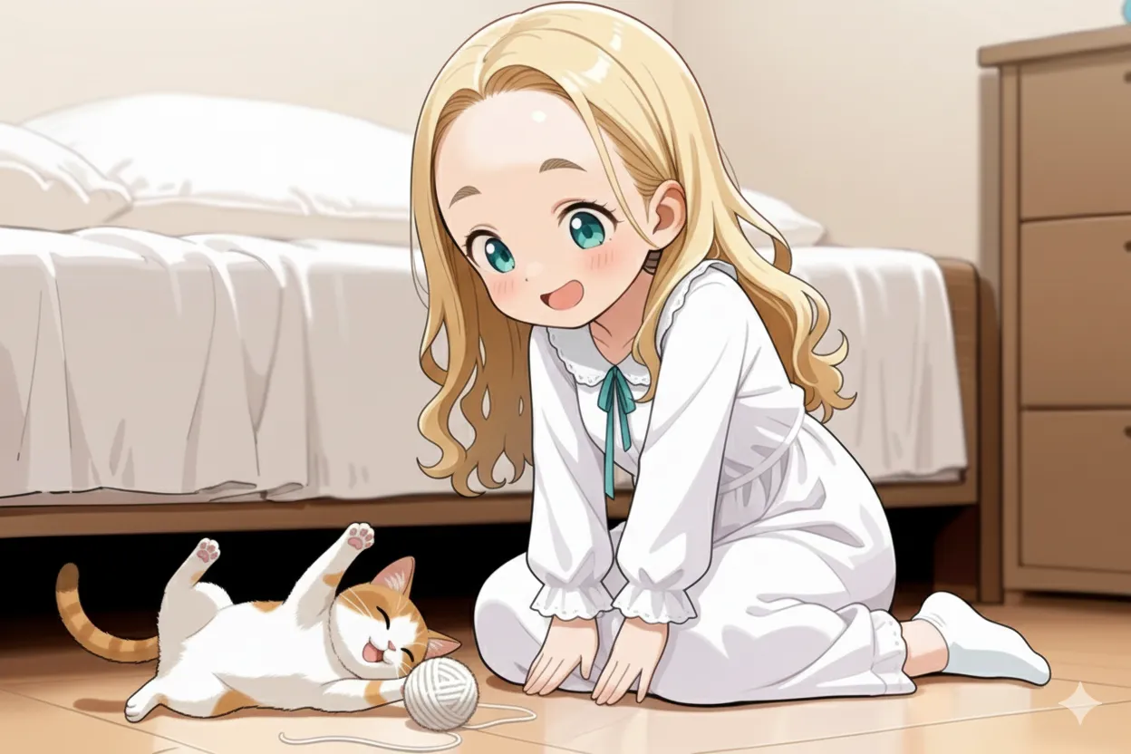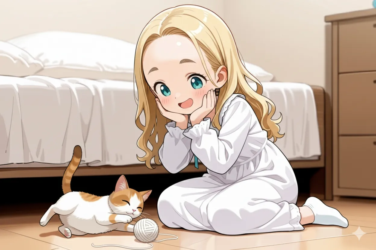 これもローカルもでるだと上手くでなくて、結局おでこちゃんと猫の絵をGeminiを使って毛玉で遊ぶ絵にしてもらいました。最初はおでこちゃんが編み物してる絵出そうとしたけどそれも上手くでなかった