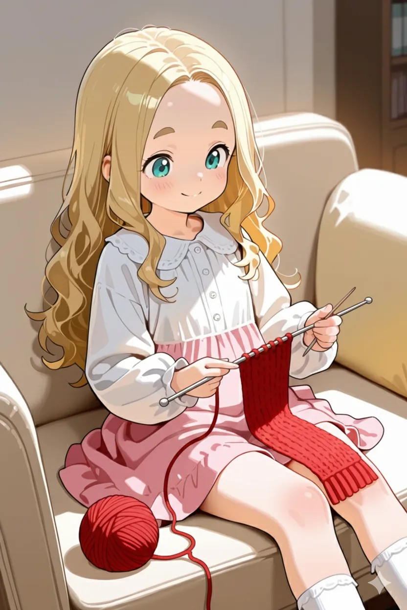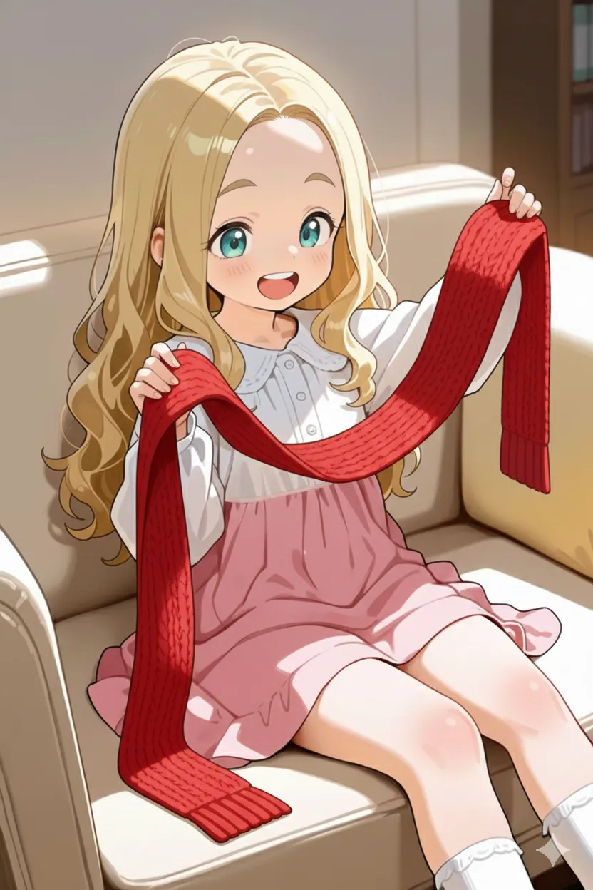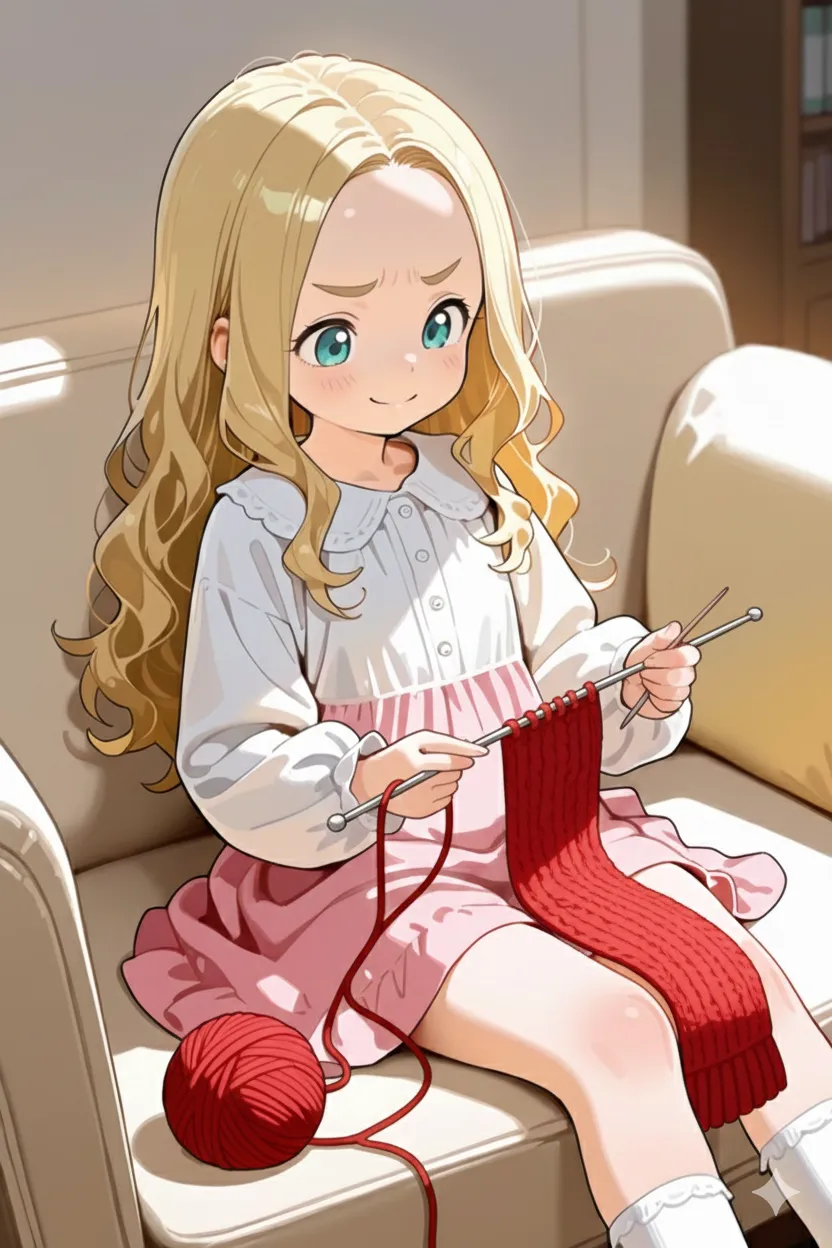 編み物に挑戦するおでこちゃん。なんとかマフラーを編み上げたのかな?