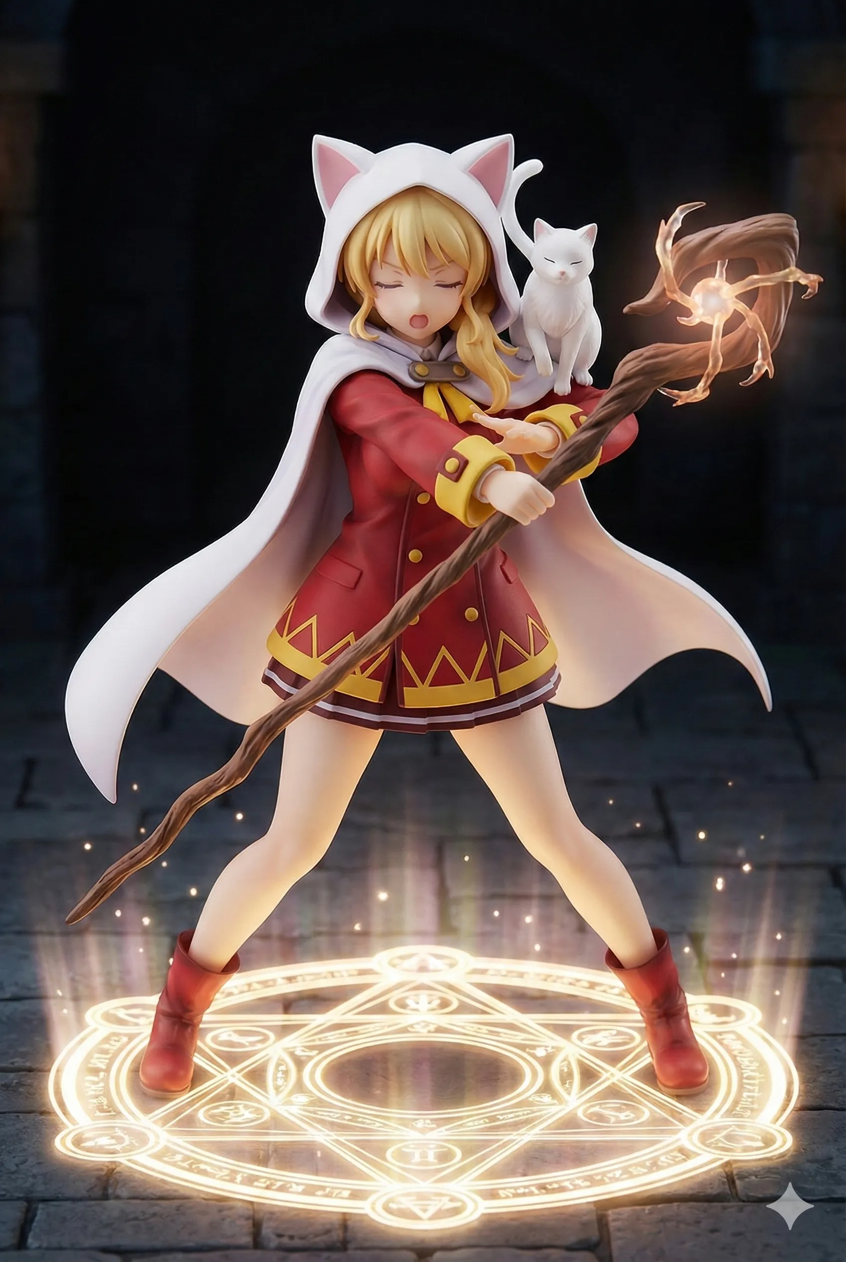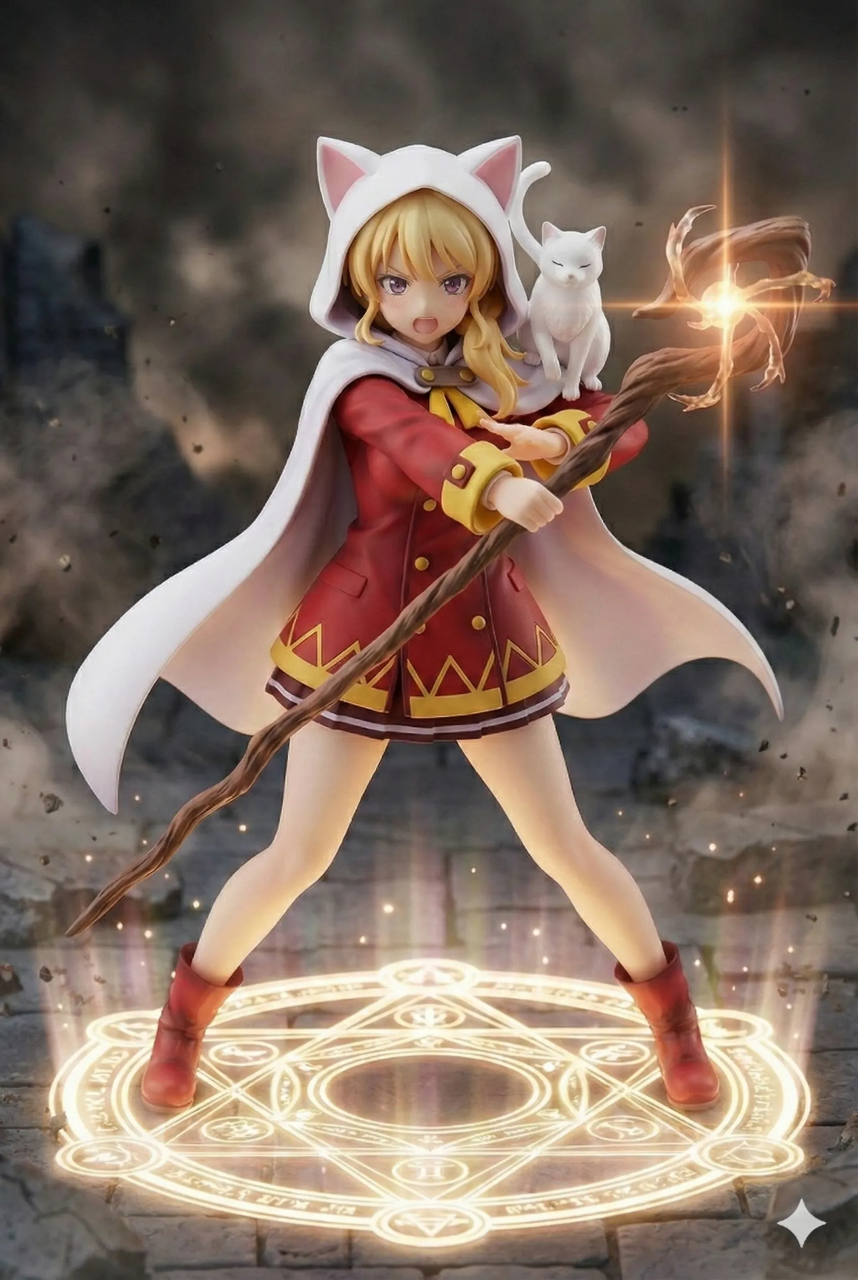 In the ruins of an ancient castle, a brave magical girl raises her staff, summoning the power of a glowing dragon. Her white cat companion perches on her shoulder, supporting her resolve. The magic circle shines brightly as she confronts the forces of darkness. In her eyes burns the flame of adventure to save the lost kingdom. Will she claim victory? This piece stirs the winds of fantasy in the reader's heart.