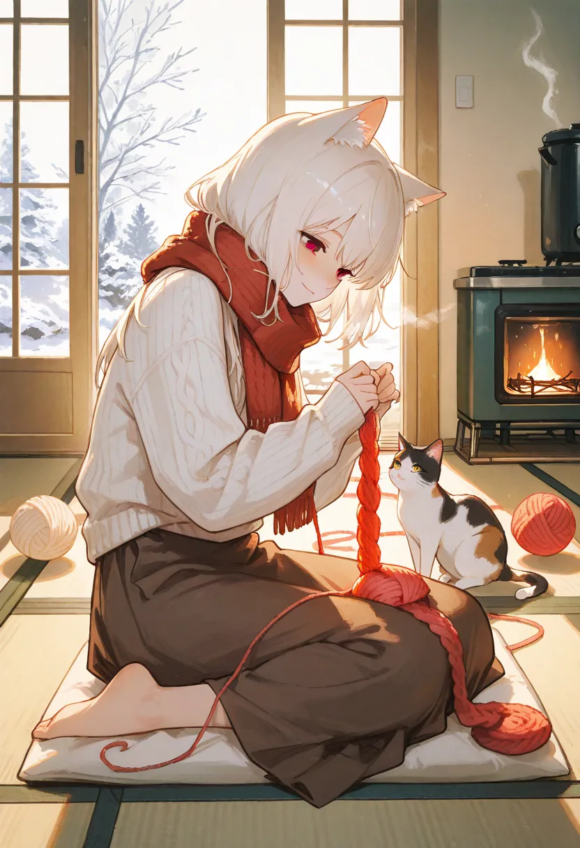 By the window overlooking a snowy landscape, a cat-eared girl quietly knits. At her feet, a little cat plays with balls of yarn, while the fireplace gently illuminates the room. Her daily life is a small adventure that makes one forget the winter chill. The sweater she's knitting— a gift for someone, or a treat for herself? In the soft light, heartwarming moments are slowly woven together.