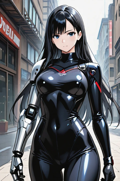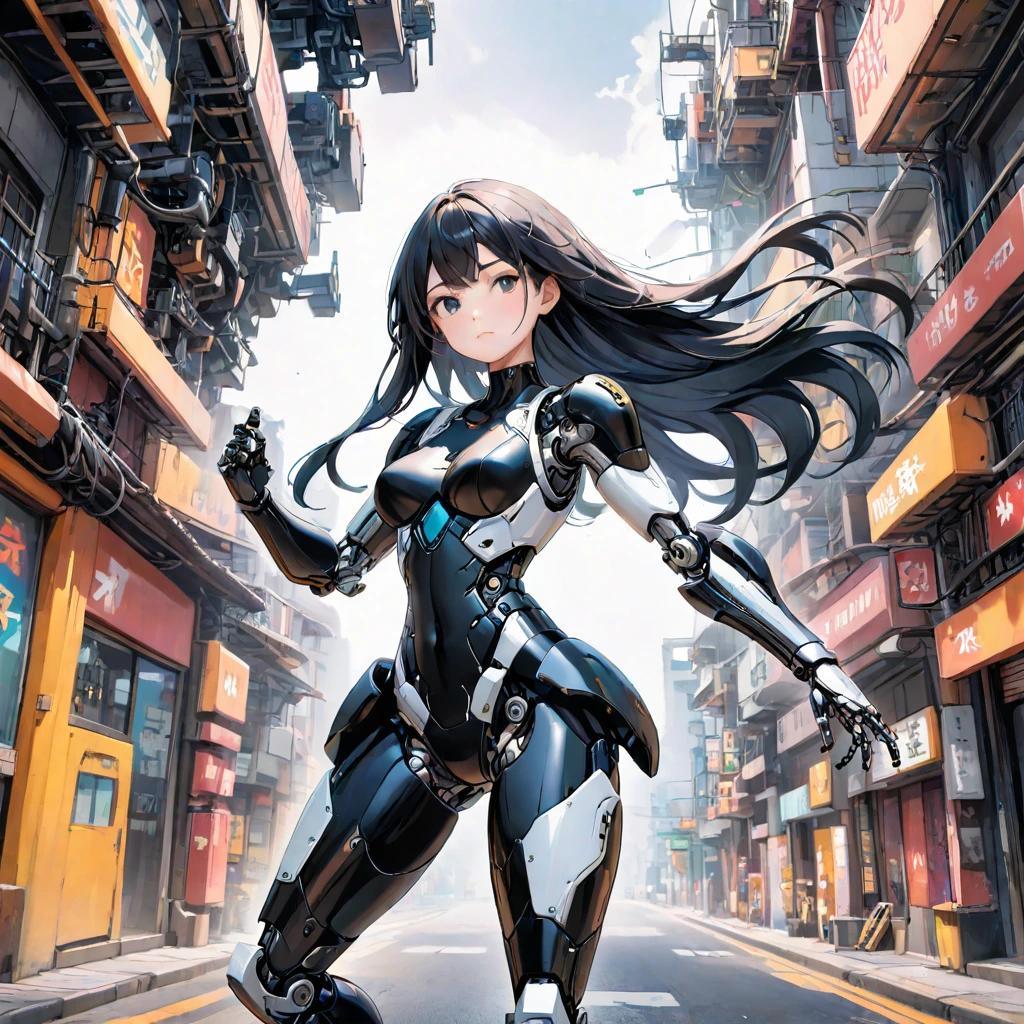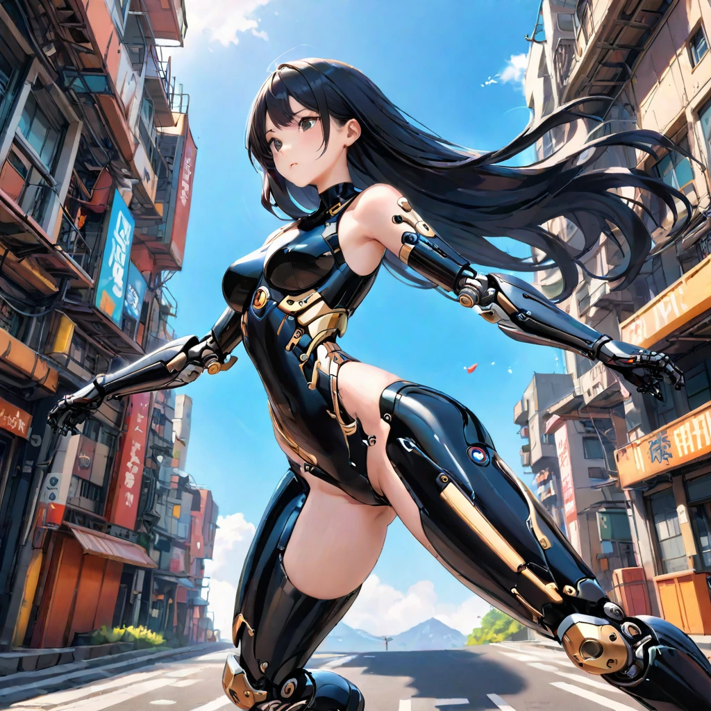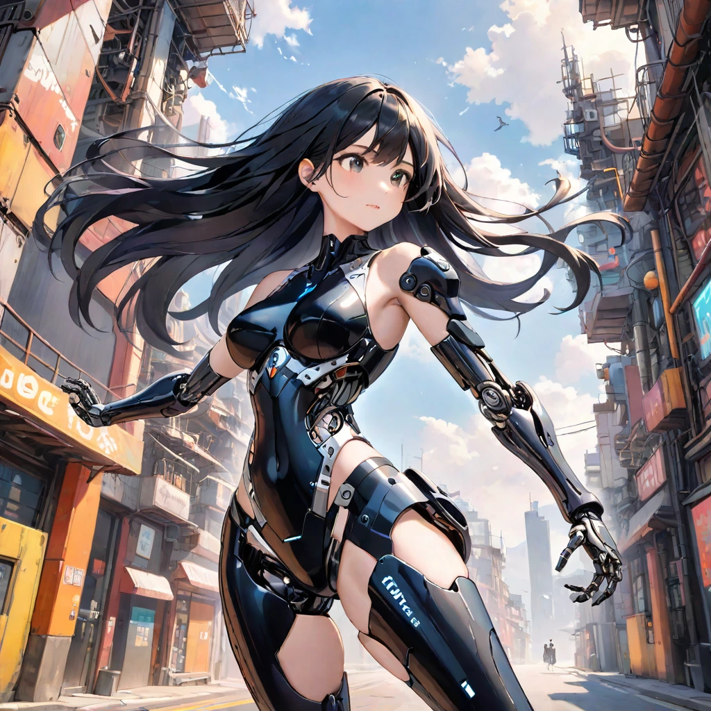 In the neon-lit alleys of a futuristic city, a black-haired girl clad in mechanical limbs stands poised. As a cybernetically enhanced human, she embarks on an adventure to escape a shadowy organization. Against the backdrop of towering buildings under a blue sky, her eyes burn with determination. Will she grasp her freedom? This captures that thrilling moment.