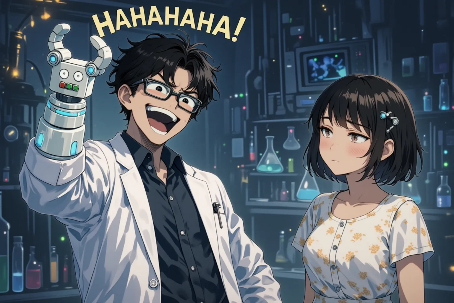 parameters: A high-quality anime style illustration in a dim, eccentric laboratory filled with strange machines, wires, blinking monitors, shelves of test tubes and chemical flasks glowing in different colors.