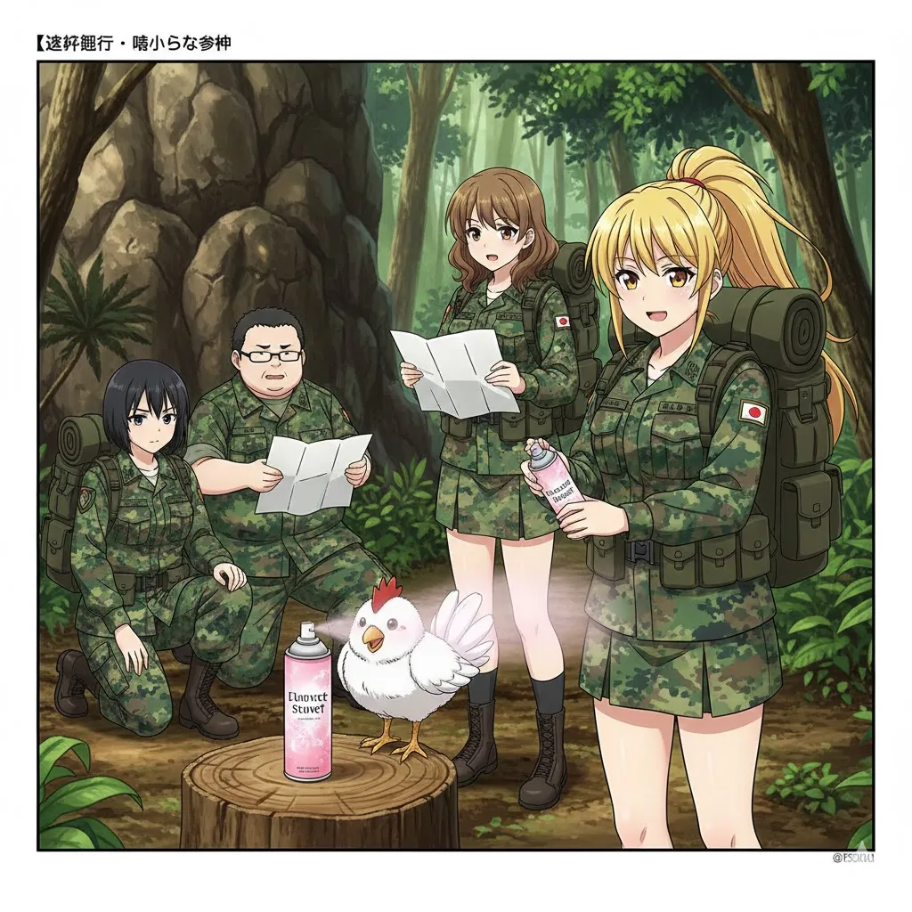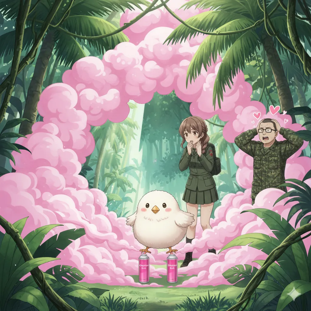 少尉はそう宣言すると、おもむろにポケットからピンク色のスプレー缶を取り出しました。 「シュッ、シュッ!」 ジャングルの生臭い風の中に、場違いなほど甘い桃の香りが広がります。