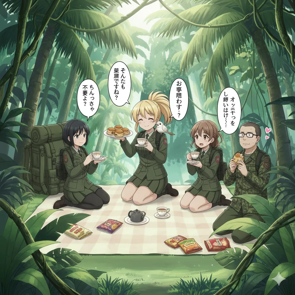 ジャングルの真ん中。甘い香りのミストと、焼き菓子の香ばしい匂いが混ざり合う中、ブロント少尉の明るい笑い声が響き渡るのでした。
