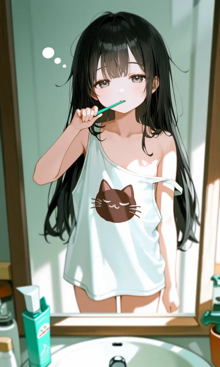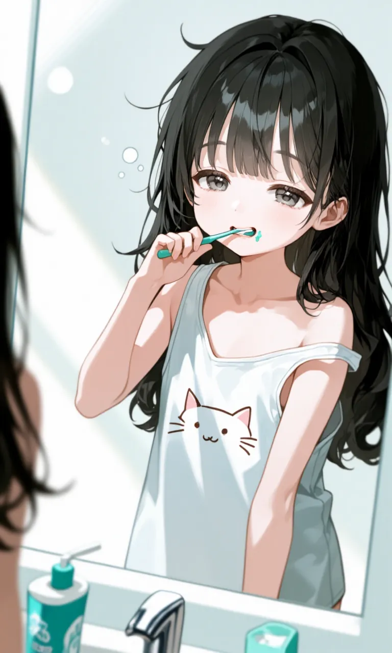 寝起きで歯磨きしている、おねむな少女ちゃんです!