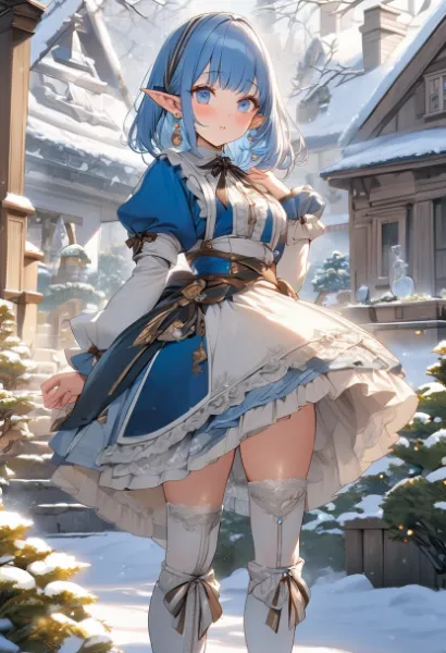 In a cozy corner cafe, a blue-haired elf girl works diligently, arranging macarons and cupcakes to greet her customers. Her smile, infused with the sweet aroma, casts a magical spell that turns ordinary days into extraordinary adventures. Posing with a peace sign behind the counter, she eagerly anticipates who might walk in next. Perhaps a traveler from another world? Her daily life, filled with sweet temptations, sparks your imagination.